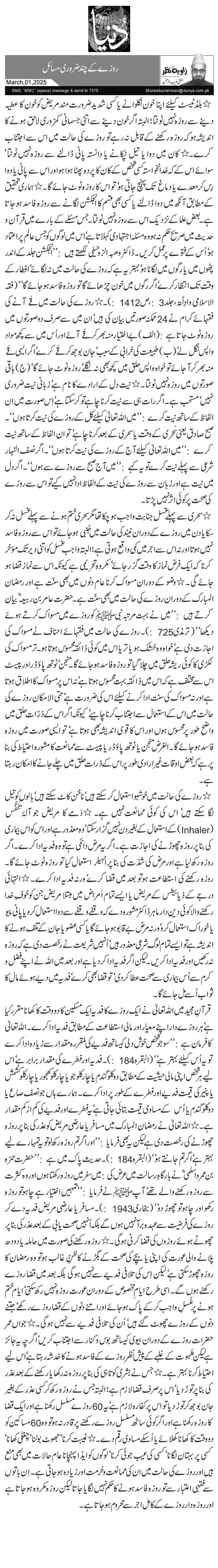 ٭بلڈ ٹیسٹ کیلئے اپنا خون نکلوانے یا کسی شدید ضرورت مند مریض کو خون کا عطیہ دینے سے روزہ نہیں ٹوٹتا؛ البتہ اگر خون دینے سے اتنی جسمانی کمزوری لاحق ہونے کا اندیشہ ہو کہ روزہ رکھنے کے قابل نہ رہے تو روزے کی حالت میں اس سے اجتناب کرے۔٭کان میں دوا یا تیل ٹپکانے یا دانستہ پانی ڈالنے سے روزہ نہیں ٹوٹتا‘ سوائے اس کے کہ خدانخواستہ کسی شخص کے کان کا پردہ پھٹا ہوا ہو اور اس سے پانی یا دوا رِس کر معدے یا دماغ تک پہنچ جاتی ہو‘ تو اس کا روزہ ٹوٹ جائے گا۔ ٭ہماری تحقیق کے مطابق آنکھ میں دوا ڈالنے یا کسی بھی قسم کا انجکشن لگانے سے روزہ فاسد ہو جاتا ہے۔ بعض علما کے نزدیک اس سے روزہ نہیں ٹوٹتا۔ جس مسئلے کے بارے میں قرآن و حدیث میں صریح حکم نہ ہو وہ مسئلہ اجتہادی کہلاتا ہے‘ اس میں لوگوں کو جس عالم پر اعتماد ہو‘ اُس کے فتوے پر عمل کریں۔ ڈاکٹر وھبہ الزوحیلی لکھتے ہیں: ''انجکشن جلد کے اندر پٹھوں میں یا رگوں میں لگانا ہو‘ بہتر یہ ہے کہ روزے کی حالت میں نہ لگائے‘ افطار کے وقت تک انتظار کرے‘ اگر رگوں میں خون چڑھائے گا تو روزہ فاسد ہو جائے گا‘‘ (فقہ الاسلامی وادِلّتہ، جلد: 3، ص: 1412)۔٭روزے کی حالت میں قَے آنے کی فقہائے کرام نے 24ممکنہ صورتیں بیان کی ہیں‘ ان میں سے صرف دو صورتوں میں روزہ ٹوٹ جاتا ہے: (الف) بے اختیار منہ بھر کر قَے آئے اور اُس میں سے کچھ مواد واپس نگل لے‘ (ب) طبیعت کی خرابی کے سبب‘ جان بوجھ کر قَے کرے‘ اگر ایسی قَے منہ بھر کر آ جائے تو خواہ واپس حلق میں کچھ بھی نہ نگلے‘ روزہ ٹوٹ جائے گا‘ (ج) باقی صورتوں میں روزہ نہیں ٹوٹتا۔ ٭نیت دل کے ارادے کا نام ہے‘ زبانی نیت ضروری نہیں‘ مستحب ہے۔ اگر رات ہی سے نیت کرنا چاہے تو کر سکتا ہے‘ اِس صورت میں ان الفاظ کے ساتھ نیت کرے: ''میں اللہ تعالیٰ کیلئے کل کے روزے کی نیت کرتا ہوں‘‘۔ صبح صادق یعنی سَحری کے وقت یا سحری کے بعد کرنا چاہے‘ تو ان الفاظ کے ساتھ نیت کرے: ''میں اللہ تعالیٰ کیلئے آج کے روزے کی نیت کرتا ہوں‘‘۔ اگر نصف النہار شرعی سے پہلے نیت کرے تو یہ کہے: ''میں آج صبح سے روزے سے ہوں‘‘۔ اگر دل میں نیت ہے اور زبان سے روزے کی نیت کے الفاظ ادا نہیں کیے تو اس سے روزے کی صحت پر کوئی اثر نہیں پڑتا۔
