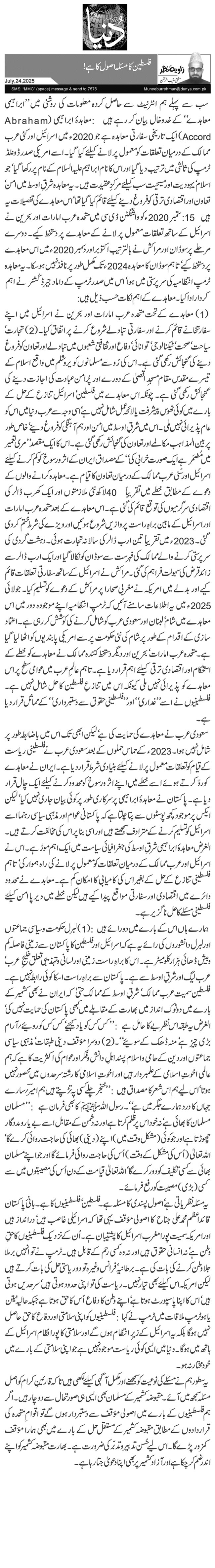 یہ سطور ہم نے مسئلے کی نوعیت کو سمجھنے اور مکمل آگہی کیلئے لکھی ہیں تاکہ قارئینِ کرام کو اصل مسئلہ سمجھ میں آئے۔ مقبوضہ کشمیر کے مسلمان بھی ایسی ہی صورتحال سے دوچار ہیں۔ اگر ہم فلسطینیوں کے بارے میں اصولی مؤقف سے دستبردار ہوں گے تو اقوامِ متحدہ کی قراردادوں کے مطابق مقبوضہ کشمیر کے مستقل حل کے بارے میں بھی ہمارا مؤقف کمزور پڑے گا۔ اس لیے حُسن تدبیر وتدبّر کی ضرورت ہے۔ بھارت مقبوضہ کشمیر کو اپنے اندر ضم کر چکا ہے اور آزاد کشمیر پر بھی اپنا دعویٰ جتا رہا ہے۔