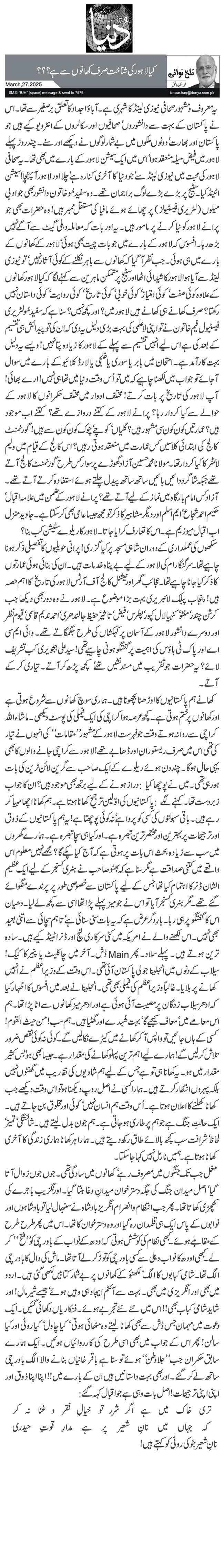 یہ معروف ومشہور صحافی نیوزی لینڈ کا شہری ہے۔ آباؤ اجداد کا تعلق برصغیر سے تھا۔ اس نے پاکستان کے بہت سے دانشوروں‘ صحافیوں اور سکالروں کے انٹرویو کیے ہیں جو پاکستان اور بھارت‘ دونوں ملکوں میں بے شمار لوگوں نے دیکھے اور سنے۔ چند روز پہلے لاہور میں فیض میلہ منعقد ہوا‘ اس میں ایک سیشن لاہور کے بارے میں بھی تھا۔ یہ صحافی لاہور کی محبت میں نیوزی لینڈ سے‘ جو دنیا کا آخری کنارہ ہے‘ چلا اور لاہور آ پہنچا! سیشن اٹینڈ کیا۔ سٹیج پر بڑے بڑے لوگ براجمان تھے۔ وہ سفید مُو خاتون دانشور بھی جو ادبی میلوں (لٹریری فیسٹیولز) پر چھائے ہوئے مافیا کی مستقل ممبر ہیں! وہ حضرات بھی جو پرانے لاہور کو نیا کرنے پر مامور ہیں۔ یہ اور بات کہ معاملہ دہلی گیٹ سے آگے نہیں بڑھ رہا۔ افسوس کہ لاہور کے بارے میں جو بات چیت بھی ہوئی‘ لاہور کے کھانوں کے بارے میں ہی ہوئی۔ جب نظر آ گیا کہ کھانوں سے باہر نکلنے کے کوئی آثار نہیں‘ تو نیوزی لینڈ سے آیا ہوا لاہور کا شیدائی اٹھا اور سٹیج پر متمکن ماہرین سے کہنے لگا کہ کیا لاہور کھانوں کے علاوہ کوئی صفت‘ کوئی امتیاز‘ کوئی خوبی‘ کوئی تاریخ‘ کوئی روایت‘ کوئی داستان نہیں رکھتا؟ صرف کھانے ہی کھانے ہیں لاہور میں؟ اور کچھ نہیں؟ سنا ہے کہ سفید مُو لٹریری فیسٹیول فیم خاتون نے تو اپنی لاعلمی کی بہت بڑی دلیل یہ دی کہ ان کی تو پیدائش ہی تقسیم کے بعد کی ہے اس لیے انہیں تقسیم سے پہلے کے لاہور کا زیادہ پتا نہیں! ویسے یہ دلیل بہت کارآمد ہے۔ امتحان میں بابر یا سوری یا خلجی یا لارڈ کلائیو کے بارے میں سوال آجائے تو جواب میں لکھنا چاہیے کہ میں تو اُس وقت دنیا میں تھا ہی نہیں! ارے بھائی! آپ لاہور کی تاریخ پر بات کرتے! مختلف ادوار میں مختلف حکمرانوں کا لاہور کے حوالے سے کیا کردار رہا؟ پرانے لاہور کے کتنے دروازے تھے؟ کتنے اب موجود ہیں؟ عمارتیں کون کون سی مشہور ہیں؟ گلیاں‘ کوچے‘ چوک کون کون سے ہیں! گورنمنٹ کالج کی ابتدائی کلاسیں کس عمارت میں منعقد ہوتی رہیں؟ اس کالج کے قیام میں ولیم لائٹنر کا کیا کردار تھا۔ مولانا محمد حسین آزاد گھوڑے پر سوار کس طرح گورنمنٹ کالج آتے تھے جبکہ شاگرد دائیں بائیں ساتھ ساتھ پیدل چلتے ہوئے استفادہ کرتے آتے تھے۔ آزاد کس امام بارگاہ میں نماز کے لیے آتے تھے؟ پرانے لاہور کے ضمن میں علامہ اقبال‘ حکیم احمد شجاع‘ ایم اسلم اور دیگر مشاہیر کا ذکر تو مجھ جیسا عامی بھی کر سکتا ہے۔ جاوید منزل اب اقبال میوزیم ہے۔ اس کا تعارف کرایا جاتا۔ لاہور کا ریلوے سٹیشن کب بنا؟