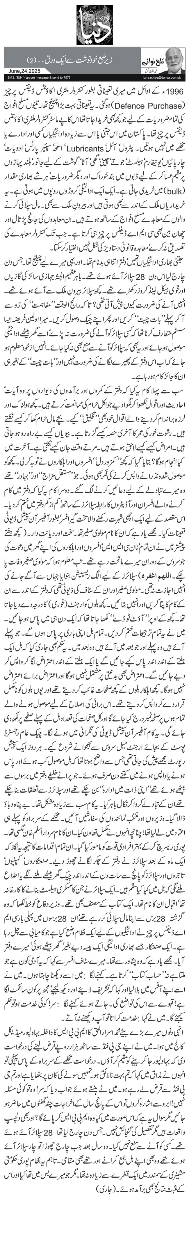 انہی دنوں میرے بڑے بیٹے محمد اسرار الحق کا ایم بی بی ایس کا داخلہ بہاولپور میڈیکل کالج میں ہوا۔ میں نے اپنے جی پی فنڈ سے ساٹھ ہزار روپے قرض لینے کی درخواست دی کہ بہاولپور جا کر بیٹے کو مقیم کر آؤں۔ درخواست محکمے کے سربراہ کے پاس پہنچی تو انہوں نے مذاق میں کہا کہ تم بہت نالائق ہو۔ تمہیں سونے کی کان پر بٹھایا ہے اور تم جی پی فنڈ سے قرض لے رہے ہو۔ میں نے ہنستے ہوئے جواب دیا کہ سر! وہ تو کوئی مسئلہ نہیں! ابرو سے اشارہ کروں تو اس کے پانچ سال کے اخراجات چند گھنٹوں میں حاضر ہو جائیں مگر سوال یہ ہے کہ اس صورت میں کیا وہ ایم بی بی ایس کر پائے گا؟ اور بھی دلچسپ واقعات ہیں مگر تفصیل کی گنجائش نہیں۔ جس دن چارج لیا تھا 28 سپلائر آئے ہوئے تھے۔ کسی کو آنے سے منع نہیں کیا۔ دو سال بعد جب چارج چھوڑا تو چار سپلائر آئے ہوئے تھے وہ بھی اپنے بل جمع کرانے اور تھے بھی مقامی۔ تاہم یہ نظام پوری حکومتی مشینری کے سمندر میں ایک قطرے سے زیادہ نہ تھا۔ مگر جو میرے بس میں تھا کیا اور اس کے مثبت نتائج بھی برآمد ہوئے۔ (جاری)