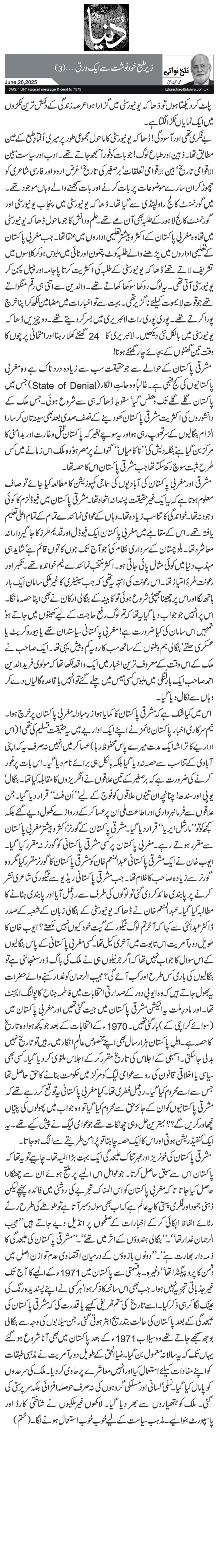 مشرقی پاکستان کے حوالے سے جو حقیقت سب سے زیادہ درد ناک ہے وہ مغربی پاکستانیوں کی کج فہمی ہے۔ غالباً وہ حالتِ انکار (State of Denial) جس میں پاکستان گلے گلے تک دھنس گیا‘ سقوطِ ڈھاکہ ہی سے شروع ہوئی۔ جس ملک کے دانشوروں کی اکثریت مشرقی پاکستان کھو دینے کے نصف صدی بعد بھی سینہ تان کر سارا الزام بنگالیوں کے سر تھوپ رہی ہو اور یہ سوچے بغیر کہ پاکستان قتل و غارت اور بد امنی کا مر کز بن گیا ہے‘ بنگلہ دیش کی ''ناکامیاں‘‘ گنوانے پر مصر ہو‘ وہ ملک اس زمانے میں کس طرح مثبت سوچ رکھ سکتا تھا جب مشرقی پاکستان اس کا حصہ تھا۔