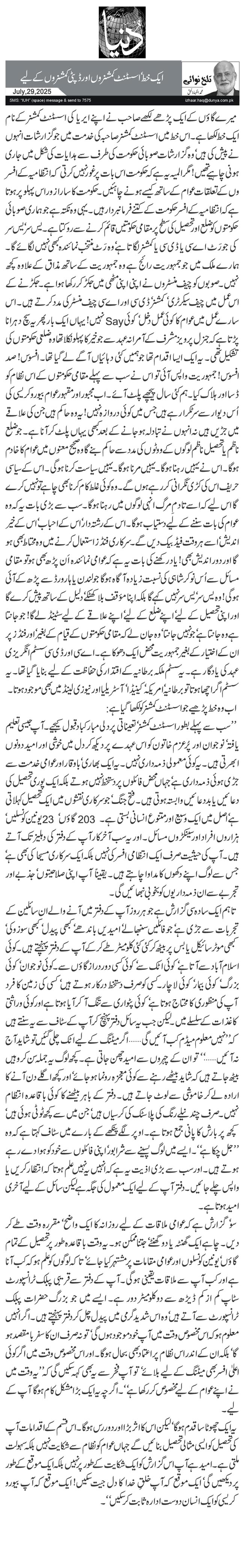 یہ ایک چھوٹا سا قدم ہو گا‘ لیکن اس کا اثر بڑا اور دوررس ہو گا۔ اس قسم کے اقدامات آپ کی تحصیل کو ایسی مثالی تحصیل بنائیں گے جہاں عوام کو نظام سے شکایت نہیں بلکہ سہولت ملتی ہے۔ امید ہے آپ اس گزارش کو ایک شکایت کے طور پر نہیں بلکہ ایک موقع کے طور پر دیکھیں گی‘ ایک موقع کہ آپ خلقِ خدا کا دل جیت سکیں! ایک موقع کہ آپ بیورو کریسی کو ایک انسان دوست ادارہ ثابت کر سکیں‘‘۔