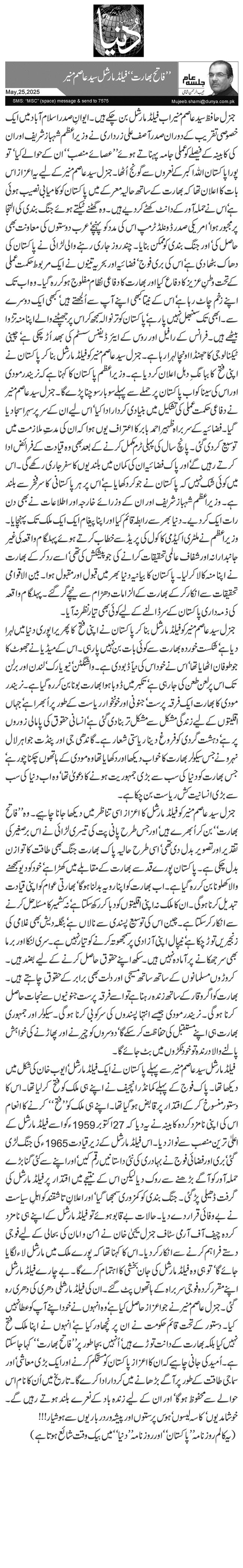 جنرل سید عاصم منیر کو فیلڈ مارشل کا اعزاز اسی تناظر میں دیکھا جانا چاہیے۔ وہ ''فاتح بھارت‘‘ بن کر اُبھرے ہیں‘ اور جس طرح پانی پت کی تیسری لڑائی نے اس برصغیر کی تقدیر اور تصویر بدل دی تھی‘ اسی طرح حالیہ پاک بھارت جنگ بھی طاقت کا توازن بدل چکی ہے۔ پاکستان پورے قد سے بھارت کے مقابلے میں کھڑا ہے‘ خود کو دیو سمجھنے والا کھلونا بن کر رہ گیا ہے۔ اب بھارت کو اپنا رویہ بدلنا ہو گا‘ بھارتی عوام کو اپنی قیادت تبدیل کرنا ہو گی۔ ان کا ملک نہ اپنی اقلیتوں کو دبا کر رکھ سکتا ہے‘ نہ کشمیر کا مسئلہ حل کرنے سے انکار کر سکتا ہے۔ چین اس کی توسیع پسندی سے نالاں ہے‘ بنگلہ دیش بھی غلامی کی زنجیریں توڑ چکا ہے‘ نیپال اپنی آزادی پر سمجھوتہ کرنے کو تیار نہیں ہے۔ سری لنکا اور برما بھی سر جھکانے پر آمادہ نہیں ہیں۔ سکھ اپنے حقوق حاصل کرنے کے لیے بضد ہیں۔ کروڑوں مسلمانوں کے ساتھ ساتھ مسیحی اور دلت بھی برابر کے حقوق چاہتے ہیں۔ بھارت کو اگر وقار کے ساتھ زندہ رہنا ہے تو اسے فرقہ پرست جنونیوں سے نجات حاصل کرنا ہو گی۔ نریندر مودی جیسے انتہا پسندوں کی سرکوبی کرنا ہو گی۔ سیکولر اور جمہوری بھارت ہی اپنے مستقبل کی حفاظت کر سکے گا‘ دوسروں کو چیرنے اور پھاڑنے کی خواہش پالنے والا درندہ تو خود ٹکڑوں میں بٹ جائے گا۔
