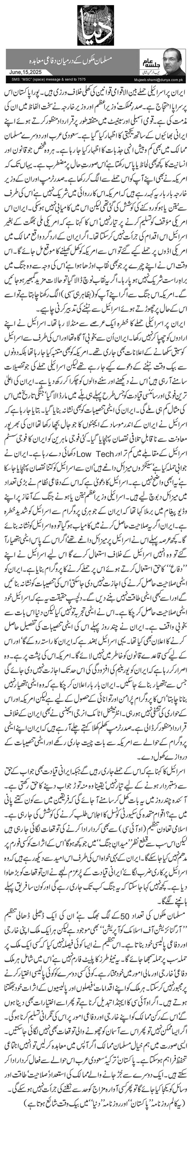 ایران پر اسرائیلی حملے بین الاقوامی قوانین کی کھلی خلاف ورزی ہیں۔ پورا پاکستان اس پر سراپا احتجاج ہے۔ صدرِ مملکت‘ وزیراعظم اور وزیر خارجہ نے سخت الفاظ میں ان کی مذمت کی ہے۔ قومی اسمبلی اور سینیٹ میں متفقہ طور پر قرارداد منظور کرتے ہوئے اپنے ایرانی بھائیوں کے ساتھ یکجہتی کا اظہار کیا گیا ہے۔ سعودی عرب اور دوسرے مسلمان ممالک میں بھی کم و بیش انہی جذبات کا اظہار کیا جا رہا ہے۔ ہر وہ شخص جو قانون اور انسانیت کا کچھ بھی لحاظ یا پاس رکھتا ہے‘ اس صورتِ حال پر مضطرب ہے۔ یہاں تک کہ امریکہ نے بھی اپنے آپ کو اس حملے سے الگ کر رکھا ہے۔ صدر ٹرمپ اور ان کے وزیر خارجہ بار بار یہ کہہ رہے ہیں کہ امریکہ اس کارروائی میں شریک نہیں ہے‘ اس کی طرف سے نیتن یاہو کو روکنے کی کوشش کی گئی تھی لیکن اس میں کامیابی نہیں ہو سکی۔ ایران اس امریکی مؤقف کو تسلیم کرنے پر تیار نہیں‘ اس کا کہنا ہے کہ امریکی ملی بھگت کے بغیر اسرائیل اس اقدام کی جرأت نہیں کر سکتا تھا۔ اگر ایران کے ارد گرد واقع ممالک میں امریکی اڈوں پر حملے کیے گئے تو اس سے امریکہ کو کھل کھیلنے کا موقع مل جائے گا۔ اس وقت اس نے اپنے چہرے پر جو بھی نقاب اوڑھا ہوا ہے‘ اس کی وجہ سے وہ جنگ میں براہِ راست شریک نہیں ہو پا رہا۔ اگر یہ نقاب نوچ ڈالا گیا تو حالات مزید گمبھیر ہو جائیں گے۔ امریکہ اس جنگ سے اگر اپنے آپ کو (بظاہر ہی سہی) الگ رکھنا چاہتا ہے تو اسے اس کے حال پر چھوڑتے ہوئے اسرائیل سے نبٹنے کی تدبیر کرنی چاہیے۔