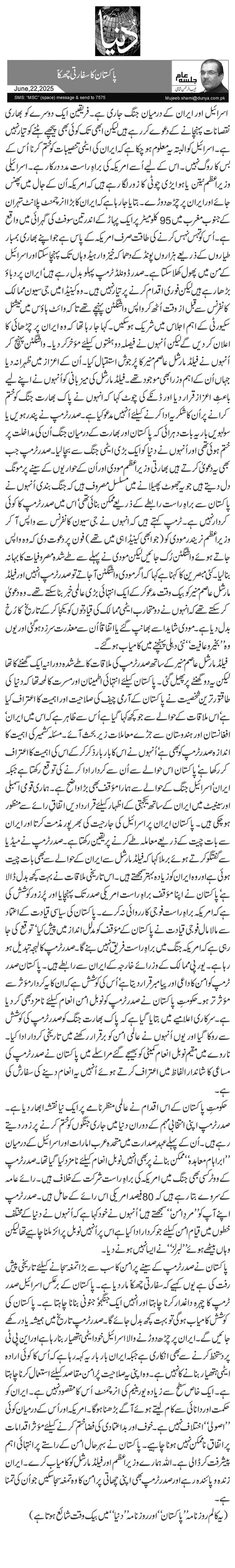 اسرائیل اور ایران کے درمیان جنگ جاری ہے۔ فریقین ایک دوسرے کو بھاری نقصانات پہنچانے کے دعوے کر رہے ہیں لیکن ابھی تک کوئی بھی پیچھے ہٹنے کو تیار نہیں ہے۔ اسرائیل کو البتہ یہ معلوم ہو چکا ہے کہ ایران کی ایٹمی تنصیبات کو ختم کرنا اُس کے بس کا روگ نہیں۔ اس کے لیے اُسے امریکہ کی براہِ راست مدد درکار ہے۔ اسرائیلی وزیراعظم نیتن یاہو ایڑی چوٹی کا زور لگا رہے ہیں کہ امریکہ اُن کے جال میں پھنس جائے اور ایران پر چڑھ دوڑے۔ بتایا جا رہا ہے کہ ایران کا بڑا انرچمنٹ پلانٹ تہران کے جنوب مغرب میں 95کلو میٹر پر ایک پہاڑ کے اندر تین سو فٹ کی گہرائی میں واقع ہے۔ اُس کو تہس نہس کرنے کی طاقت صرف امریکہ کے پاس ہے جو اپنے بھاری بمبار طیاروں کے ذریعے ہزاروں پونڈ کے دھماکہ خیز وار ہیڈ وہاں تک پہنچا سکتا اور اسرائیل کے من میں پھول کھلا سکتا ہے۔ صدر ڈونلڈ ٹرمپ پہلو بدل رہے ہیں‘ ایران پر دباؤ بڑھا رہے ہیں لیکن فوری اقدام کرنے پر تیار نہیں ہیں۔ وہ کینیڈا میں جی سیون ممالک کانفرنس سے قبل از وقت اُٹھ کر واپس واشنگٹن پہنچے تھے تاکہ وائٹ ہاؤس میں نیشنل سکیورٹی کے اہم اجلاس میں شریک ہو سکیں۔ کہا جا رہا تھا کہ وہ ایران پر چڑھائی کا اعلان کر دیں گے لیکن اُنہوں نے فیصلہ دو ہفتوں کیلئے مؤخرکر دیا۔ واشنگٹن پہنچ کر اُنہوں نے فیلڈ مارشل عاصم منیر کا پُرجوش استقبال کیا۔ اُن کے اعزاز میں ظہرانہ دیا جہاں اُن کے اہم وزرا بھی موجود تھے۔ فیلڈ مارشل کی میزبانی کو اُنہوں نے اپنے لیے باعثِ اعزاز قرار دیا اور ڈنکے کی چوٹ کہا کہ انہوں نے پاک بھارت جنگ کو ختم کرانے پر اُن کا شکریہ ادا کرنے کیلئے اُنہیں مدعو کیا ہے۔ صدر ٹرمپ نے پندرہویں یا سولہویں بار یہ بات دہرائی کہ پاکستان اور بھارت کے درمیان جنگ اُن کی مداخلت پر ختم ہوئی تھی اور اُنہوں نے دنیا کو ایک بڑی ایٹمی جنگ سے بچا لیا۔ صدر ٹرمپ جب بھی یہ دعویٰ کرتے ہیں بھارتی وزیراعظم مودی اور اُن کے حواریوں کے سینے پر مونگ دل دیتے ہیں جو یہ جھوٹ پھیلانے میں مسلسل مصروف ہیں کہ جنگ بندی اُنہوں نے پاکستان سے براہِ راست رابطے کے ذریعے ممکن بنائی تھی‘ اس میں صدر ٹرمپ کا کوئی کردار نہیں ہے۔ ٹرمپ کہتے ہیں کہ انہوں نے جی سیون کانفرنس سے واپس آ کر وزیراعظم نریندر مودی کو (جو ابھی کینیڈا ہی میں تھے) فون پر دعوت دی کہ وہ واپس جاتے ہوئے واشنگٹن رُک جائیں لیکن مودی نے پہلے سے طے شدہ مصروفیات کا بہانہ بنا لیا۔ کئی مبصرین کا کہنا ہے کہا کہ اگر مودی واشنگٹن آ جاتے تو صدر ٹرمپ انہیں اور فیلڈ مارشل عاصم منیر کو بیک وقت مدعو کرکے ایک انتہائی بڑی عالمی خبر بنا سکتے تھے۔ وہ دعویٰ کر سکتے تھے کہ انہوں نے دو متحارب ایٹمی ممالک کی قیادتوں کو یکجا کرکے تاریخ کا رُخ بدل دیا ہے۔ مودی شاید اسے بھانپ گئے یا اتفاقاً اُن سے معذرت سر زد ہو گئی اور یوں وہ ''بخیرو عافیت‘‘ نئی دہلی پہنچنے میں کامیاب ہو گئے۔