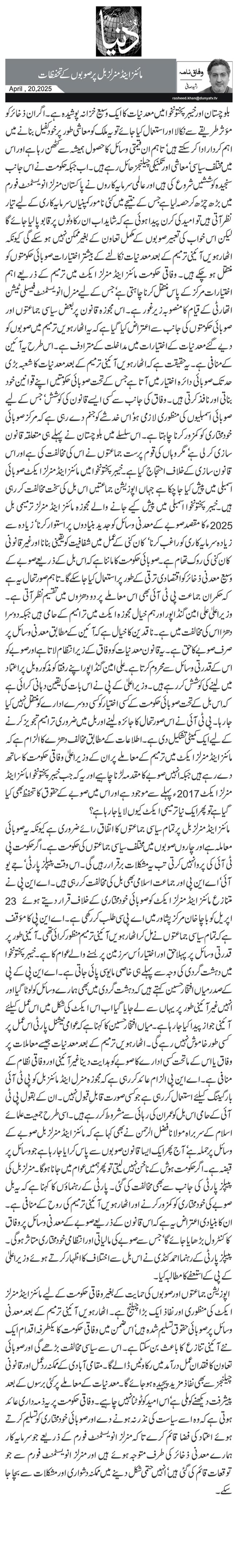 مائنز اینڈ منرلز بل پر تمام سیاسی جماعتوں کا اتفاق رائے ضروری ہے کیونکہ یہ صوبائی معاملہ ہے اور چاروں صوبوں میں مختلف سیاسی جماعتوں کی حکومت ہے۔ اگر حکومت پی ٹی آئی کی پروا نہیں کرتی تب یہ مشکلات برقرار رہیں گی۔ اس وقت پیپلز پارٹی‘ جے یو آئی‘ اے این پی اور جماعت اسلامی بھی بل کی مخالفت کر رہی ہیں۔ اے این پی نے متنازع مائنز اینڈ منرلز ایکٹ کو صوبائی خودمختاری کے خلاف قرار دیتے ہوئے 23 اپریل کو باچا خان مرکز پشاور میں اے پی سی طلب کر رکھی ہے۔ اے این پی کا مؤقف ہے کہ تمام سیاسی جماعتوں نے مل کر اٹھارہویں آئینی ترمیم منظور کرائی تھی۔ آئینی طور پر قدرتی وسائل پر پہلا حق اور اختیار اُس سرزمین پر بسنے والے عوام کا ہے۔ خیبر پختونخوا میں دہشت گردی کی وجہ سے پہلے ہی خاصی مایوسی پائی جاتی ہے۔ اے این پی کے پی کے صدر میاں افتخار حسین کہتے ہیں کہ دہشت گردی میں بھی ہمارے وسائل کو لوٹا گیا اور انہیں غیر آئینی طور پر یہاں سے لے جایا گیا اب اس ایکٹ کی شکل میں اس عمل کیلئے آئینی جواز پیدا کیا جا رہا ہے۔ میاں افتخار حسین کا کہنا ہے کہ عوامی نیشنل پارٹی اس عمل پر کسی طور خاموش نہیں رہے گی۔ اٹھارہویں ترمیم کے بعد معدنیات جیسے معاملات پر وفاق یا اس کے ماتحت کسی ادارے کا صوبے کو ہدایت دینا غیر آئینی اور وفاقی نظام کے منافی ہے۔ اے این پی الزام عائد کر رہی ہے کہ مجوزہ منرل اینڈ مائنز بل کو پی ٹی آئی بارگیننگ کیلئے استعمال کر رہی ہے جو کسی صورت قابلِ قبول نہیں۔ ان کے بقول پی ٹی آئی کے حامی اس بل کو عمران کی رہائی سے مشروط کر رہے ہیں۔ اسی طرح جمعیت علمائے اسلام کے سربراہ مولانا فضل الرحمن نے بھی کہا ہے کہ مائنز اینڈ منرلز بل صوبے کے وسائل پر حملہ ہے‘ آج پھر ایک ایسا قانون صوبوں سے پاس کرایا جا رہا ہے جو وسائل پر قبضہ ہے۔ اگر حکومت ہوش کے ناخن نہیں لیتی تو پھر ہمیں عوام میں جانا ہو گا۔ منرلز بل کی پیپلز پارٹی کی جانب سے بھی مخالفت کی گئی۔ پارٹی کے رہنمائوں کا کہنا ہے کہ یہ بل صوبے کی خود مختاری کو کمزور کرنے اور اٹھارہویں آئینی ترمیم کی روح کے منافی ہے۔ ان کا بنیادی اعتراض یہ ہے کہ اس قانون کے ذریعے صوبے کے معدنی وسائل پر وفاق کا کنٹرول بڑھایا جائے گا‘ جس سے صوبے کی مالیاتی اور انتظامی خودمختاری متاثر ہو گی۔ پیپلز پارٹی کے رہنما احمد کنڈی نے اس بل سے اختلاف کا اظہار کرتے ہوئے وزیراعلیٰ کے پی کے استعفے کا مطالبہ کیا۔