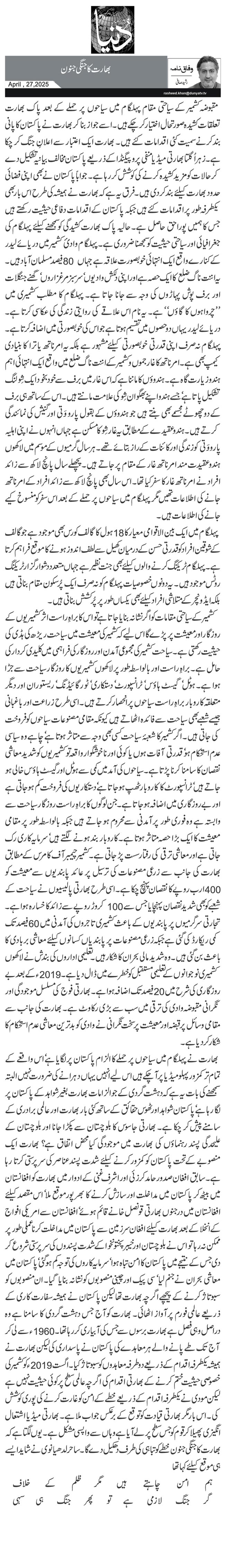 بھارت نے پہلگام میں سیاحوں پر حملے کا الزام پاکستان پر لگایا ہے‘ اس واقعے کے تمام تر کمزور پہلو میڈیا پر آ چکے ہیں اس لیے انہیں یہاں دہرانے کی ضرورت نہیں البتہ سمجھنے کی بات یہ ہے کہ دہشت گردی کے جو الزامات بھارت بغیر شواہد کے پاکستان پر لگا رہا ہے‘ پاکستان شواہد اور ٹھوس حقائق کے ساتھ کئی بار بھارت اور عالمی برادری کے سامنے پیش کر چکا ہے۔ بھارتی جاسوس کا بلوچستان سے پکڑا جانا اور بلوچستان کے علیحدگی پسند رہنماؤں کی بھارت میں موجودگی کیا محض اتفاق ہے؟ بھارت ایک منصوبے کے تحت پاکستان کو کمزور کرنے کیلئے شدت پسند عناصر کی سرپرستی کرتا رہا ہے۔ سابق افغان صدور حامد کرزئی اور اشرف غنی کے ادوار میں بھارت کو افغانستان میں بیٹھ کر پاکستان میں مداخلت اور سازش کرنے کا بھرپور موقع ملا‘ اس مقصد کیلئے افغانستان میں درجنوں بھارتی قونصل خانے قائم ہوئے‘ افغانستان سے امریکی افواج کے انخلا کے بعد بھارت کیلئے افغان سرزمین سے پاکستان میں مداخلت کرنا عملی طور پر ممکن نہ رہا تو اس نے بلوچستان اور خیبرپختونخوا کے شدت پسندوں کی سرپرستی شروع کر دی جس کے نتیجے میں پاکستان کا امن تباہ ہوا‘ سرمایہ کاروں کی توجہ کم ہو گئی‘ پاکستان میں معاشی بحران نے جنم لیا‘ سی پیک اور چینی منصوبوں کو نشانہ بنایا گیا۔ ان منصوبوں کو سبوتاژ کرنے کے پیچھے اگرچہ بھارت تھا لیکن پاکستان نے ہمیشہ سفارت کاری کے ذریعے عالمی فورم پر آواز اٹھائی۔ بھارت کو آج جس دہشت گردی کا سامنا ہے وہ دراصل وہی فصل ہے بھارت برسوں سے جس کی آبیاری کر رہا تھا۔ 1960ء سے لی کر آج تک طے پانے والے ہر معاہدے کی پاکستان نے پاسداری کی لیکن بھارت نے ہمیشہ یکطرفہ اقدام کے ذریعے دوطرفہ معاہدوں کو سبوتاژ کیا۔ اگست 2019ء کو کشمیر کی خصوصی حیثیت ختم کرنے کے بھارتی اقدام کی اگرچہ عالمی سطح پر کوئی حیثیت نہیں ہے لیکن مودی نے یکطرفہ اقدام کے ذریعے خطے کے امن کو غارت کرنے کی پوری کوشش کی۔ اس بار مگر بھارتی قیادت کو توقع کے برعکس جواب ملا ہے۔ بھارتی میڈیا اشتعال انگیزی پھیلا کر قوم کو جس سطح پر لے آیا ہے وہاں سے واپسی مشکل ہے۔ یوں لگتا ہے کہ بھارت کا جنگی جنون خطے کو تباہی کی طرف دھکیل دے گا۔ ساحر لدھیانوی نے شاید ایسے ہی موقع کیلئے کہا تھا