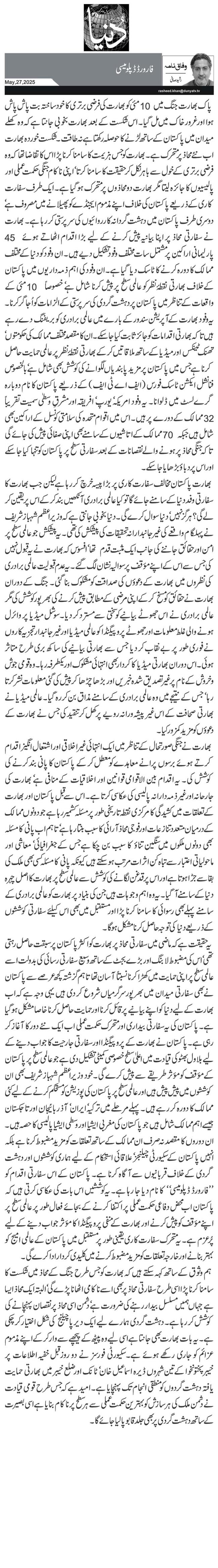 بھارت پاکستان مخالف سفارت کاری پر بڑا پیسہ خرچ کر رہا ہے لیکن جب بھارت کا سفارتی وفد دنیا کے سامنے جائے گا تو کیا عالمی برادری آنکھیں بند کر کے اس پر یقین کر لے گی؟ ہرگز نہیں‘ دنیا سوال کرے گی۔ دنیا بخوبی جانتی ہے کہ وزیراعظم شہباز شریف نے پہلگام واقعے کی غیرجانبدارانہ تحقیقات کی پیشکش کی تھی۔ یہ پیشکش جو عالمی سطح پر امن اور حقائق جاننے کی جانب ایک مثبت قدم تھا‘ افسوس کہ بھارت نے یہ قبول نہیں کی جس سے اس کے اپنے مؤقف پر سوالیہ نشان لگ گئے۔ یہ عدم قبولیت عالمی برادری کی نظروں میں بھارت کے دعوؤں کی صداقت کو مشکوک بنا گئی۔ جنگ کے دوران بھارت نے حقائق کو مسخ کر کے اپنی مرضی کے مطابق پیش کرنے کی بھرپور کوشش کی مگر عالمی برادری نے اس جھوٹے بیانیے کو سختی سے مسترد کر دیا۔ سوشل میڈیا پر وائرل ہونے والی غلط معلومات اور جھوٹے پروپیگنڈا کو عالمی میڈیا اور غیر جانبدار تجزیہ کاروں نے فوری طور پر بے نقاب کر دیا جس سے بھارتی بیانیے کی ساکھ بری طرح متاثر ہوئی۔ اس دوران بھارتی میڈیا کا کردار بھی انتہائی مشکوک اور یکطرفہ رہا۔ وہ قومی جوش و خروش کے نام پر غیرتصدیق شدہ خبریں اور بڑھا چڑھا کر پیش کی گئی معلومات نشر کرتا رہا‘ جس کے نتیجے میں وہ عالمی برادری کے سامنے مذاق بن کر رہ گیا۔ عالمی میڈیا نے بھارتی صحافت کے اس غیر پیشہ ورانہ رویے پر کھل کر تنقید کی جس نے بھارت کے دعوؤں کو مزید کمزور کیا۔