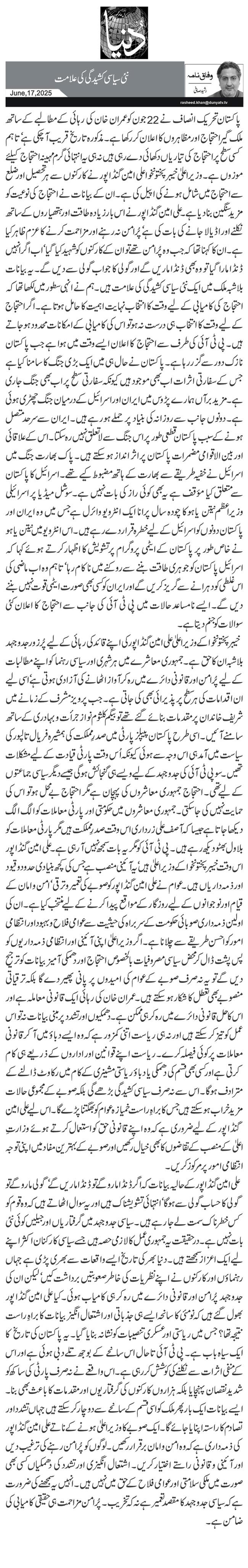 پاکستان تحریک انصاف نے 22جون کو عمران خان کی رہائی کے مطالبے کے ساتھ ملک گیر احتجاج اور مظاہروں کا اعلان کر رکھا ہے۔ مذکورہ تاریخ قریب آ چکی ہے‘ تاہم کسی سطح پر احتجاج کی تیاریاں دکھائی دے رہی ہیں نہ ہی یہ انتہائی گرم مہینہ احتجاج کیلئے موزوں ہے۔ وزیراعلیٰ خیبر پختونخوا علی امین گنڈا پور نے کارکنوں سے ہر تحصیل اور ضلع سے احتجاج میں شامل ہونے کی اپیل کی ہے۔ ان کے بیانات نے احتجاج کی نوعیت کو مزید سنگین بنا دیا ہے۔ علی امین گنڈا پور نے اس بار زیادہ طاقت اور ہتھیاروں کے ساتھ نکلنے اور اڈیالا جانے کی بات کی ہے‘ پُرامن نہ رہنے اور مزاحمت کرنے کا عزم ظاہر کیا ہے۔ ان کا کہنا تھا کہ جب وہ پُرامن تھے تو ان کے کارکنوں کو شہید کیا گیا‘ اب اگر انہیں ڈنڈا مارا گیا تو وہ بھی ڈنڈا ماریں گے اور گولی کا جواب گولی سے دیں گے۔ یہ بیانات بلاشبہ ملک میں ایک نئی سیاسی کشیدگی کی علامت ہیں۔ ہم نے انہی سطور میں لکھا تھا کہ احتجاج کی کامیابی کے لیے وقت کا انتخاب نہایت اہمیت کا حامل ہوتا ہے۔ اگر احتجاج کے لیے وقت کا انتخاب ہی درست نہ ہو تو اس کی کامیابی کے امکانات محدود ہو جاتے ہیں۔ پی ٹی آئی کی طرف سے احتجاج کا اعلان ایسے وقت میں ہوا ہے جب پاکستان نازک دور سے گزر رہا ہے۔ پاکستان نے حال ہی میں ایک بڑی جنگ کا سامنا کیا ہے جس کے سفارتی اثرات اب بھی موجود ہیں کیونکہ سفارتی سطح پر اب بھی جنگ جاری ہے۔ مزید برآں ہمارے پڑوس میں ایران اور اسرائیل کے درمیان جنگ چھڑ ی ہوئی ہے۔ دونوں جانب سے روزانہ کی بنیاد پر حملے ہو رہے ہیں۔ ایران سے سرحد متصل ہونے کے سبب پاکستان قطعی طور پر اس جنگ سے لاتعلق نہیں رہ سکتا۔ اس کے علاقائی اور بین الاقوامی مضمرات پاکستان پر اثر انداز ہو سکتے ہیں۔ پاک بھارت جنگ میں اسرائیل نے خفیہ طریقے سے بھارت کے ہاتھ مضبوط کیے تھے۔ اسرائیل کا پاکستان سے متعلق کیا مؤقف ہے یہ بھی کوئی راز کی بات نہیں ہے۔ سوشل میڈیا پر اسرائیلی وزیراعظم نیتن یاہو کا چودہ سال پرانا ایک انٹرویو وائرل ہے جس میں وہ ایران اور پاکستان دونوں کو اسرائیل کے لیے خطرہ قرار دے رہے ہیں۔ اس انٹرویو میں نیتن یاہو نے خاص طور پر پاکستان کے ایٹمی پروگرام پر تشویش کا اظہار کرتے ہوئے کہا کہ اسرائیل پاکستان کو جوہری طاقت بننے سے روکنے میں ناکام رہا‘ تاہم وہ اب ماضی کی اس غلطی کو دہرانے سے گریز کریں گے اور ایران کو کسی بھی صورت ایٹمی قوت نہیں بننے دیں گے۔ ایسے نامساعد حالات میں پی ٹی آئی کی جانب سے احتجاج کا اعلان کئی سوالات کو جنم دیتا ہے۔