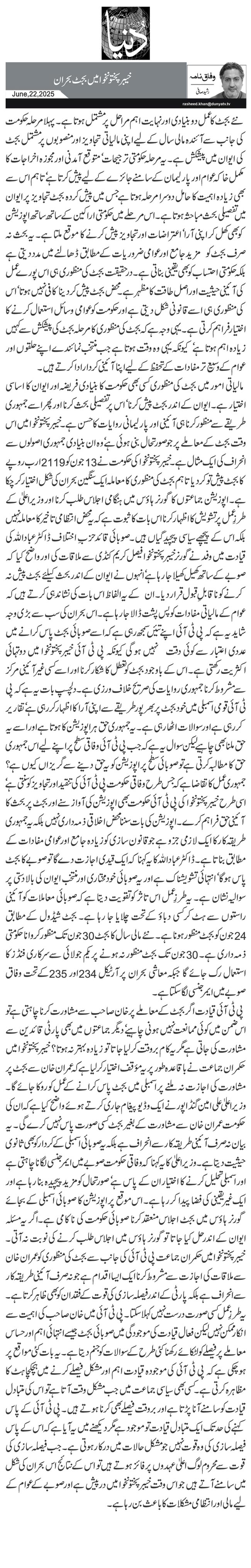 مالیاتی امور میں بجٹ کی منظوری کسی بھی حکومت کا بنیادی فریضہ اور ایوان کا اساسی اختیار ہے۔ ایوان کے اندر بجٹ پیش کرنا‘ اس پر تفصیلی بحث کرنا اور پھر اسے جمہوری طریقے سے منظور کرنا ہی آئینی اور پارلیمانی روایات کا حسن ہے۔ خیبرپختونخوا میں اس وقت بجٹ کے معاملے پر جو صورتحال بنی ہوئی ہے‘ وہ ان بنیادی جمہوری اصولوں سے انحراف کی ایک مثال ہے۔ خیبرپختونخوا کی حکومت نے 13جون کو 2119ارب روپے کا بجٹ پیش تو کر دیا تاہم بجٹ کی منظوری کا معاملہ ایک سنگین بحران کی شکل اختیار کر چکا ہے۔ اپوزیشن جماعتوں کا گورنر ہاؤس میں ہنگامی اجلاس طلب کرنا اور وزیراعلیٰ کے طرزِ عمل پر تشویش کا اظہار کرنا اس بات کا ثبوت ہے کہ یہ محض انتظامی تاخیر کا معاملہ نہیں بلکہ اس کے پیچھے سیاسی پیچیدگیاں ہیں۔ صوبائی قائد حزبِ اختلاف ڈاکٹر عباداللہ کی قیادت میں وفد نے گورنر خیبرپختونخوا فیصل کریم کنڈی سے ملاقات کی اور واضح کیا کہ صوبے کے ساتھ کھیل کھیلا جا رہا ہے‘ انہوں نے ایوان کے اندر بحث کیلئے بجٹ پیش نہ کرنے کو ناقابلِ قبول قرار دیا۔ ان کے یہ الفاظ اس بات کی نشاندہی کرتے ہیں کہ عوام کے مالیاتی مفادات کو پس پشت ڈالا جا رہا ہے۔ اس بحران کی سب سے بڑی وجہ شاید یہ ہے کہ پی ٹی آئی اپنے تئیں سمجھ رہی ہے کہ اسے صوبائی بجٹ پاس کرانے میں عددی اعتبار سے کوئی دقت نہیں ہو گی کیونکہ پی ٹی آئی خیبرپختونخوا میں دوتہائی اکثریت رکھتی ہے۔ اس کے باوجود بجٹ کو تعطل کا شکار کرنا اور اسے کسی غیرآئینی مرکز سے مشروط کرنا جمہوری روایات کی صریح خلاف ورزی ہے۔ دلچسپ بات یہ ہے کہ پی ٹی آئی قومی اسمبلی میں خود بجٹ پر بھرپور طریقے سے اپنی آرا کا اظہار کر رہی ہے‘ تقاریر کر رہی ہے اور سوالات اٹھا رہی ہے۔ یہ جمہوری حق ہر اپوزیشن کا ہوتا ہے اور اسے یہ حق ملنا بھی چاہیے لیکن سوال یہ ہے کہ جب پی ٹی آئی وفاقی سطح پر اپنے لیے اس جمہوری حق کا مطالبہ کرتی ہے تو صوبائی سطح پر اپوزیشن کو یہ حق دینے سے گریزاں کیوں ہے؟ جمہوری عمل کا تقاضا ہے کہ جس طرح وفاقی حکومت پی ٹی آئی کی تنقید اور تجاویز کو سنتی ہے‘ اسی طرح خیبرپختونخوا کی پی ٹی آئی حکومت بھی اپوزیشن کی آواز سنے اور بجٹ پر بحث کا آئینی حق فراہم کرے۔ اپوزیشن کی بات سننا محض اخلاقی ذمہ داری نہیں بلکہ یہ جمہوری طریقہ کار کا ایک لازمی جزو ہے جو قانون سازی کو زیادہ جامع اور عوامی مفادات کے مطابق بناتا ہے۔ ڈاکٹر عباداللہ کا یہ کہنا کہ ایک قیدی اجازت دے گا تو صوبے کا بجٹ پاس ہو گا‘ انتہائی تشویشناک ہے اور یہ صوبائی خود مختاری اور منتخب ایوان کی بالادستی پر سوالیہ نشان ہے۔ یہ طرزِ عمل اس تاثر کو تقویت دیتا ہے کہ صوبائی معاملات کو آئینی راستوں سے ہٹ کر کسی دباؤ کے تحت چلایا جا رہا ہے۔ بجٹ شیڈول کے مطابق 24جون کو بجٹ منظور ہونا ہے۔ نئے مالی سال کا بجٹ 30جون تک منظور کروانا حکومتی ذمہ داری ہے۔ 30جون تک بجٹ منظور نہ ہونے پر یکم جولائی سے سرکاری فنڈز کا استعمال رک جائے گا جبکہ معاشی بحران پر آرٹیکل 234اور 235کے تحت وفاق صوبے میں ایمرجنسی لگا سکتا ہے۔