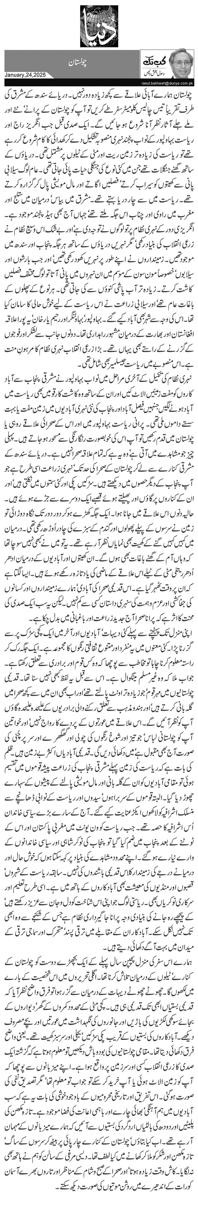 چولستان ہمارے آبائی علاقے سے کچھ زیادہ دور نہیں۔ دریائے سندھ کے مشرق کی طرف تقریباً تیس چالیس کلومیٹر سفر طے کریں تو آپ کو چولستان کے پرانے‘ نئے اور ملے جلے آثار نظر آنا شروع ہو جائیں گے۔ ایک صدی قبل جب انگریز راج اور ریاست بہاولپور کے نواب پنجند نہری منصوبہ تشکیل دے کر کھدائی کا کام شروع کر رہے تھے تو ریاست کی زیادہ تر زمین ریت اور مٹی کے ٹیلوں پر مشتمل تھی۔ دریائوں کے ساتھ گھنے جنگلات تھے جن میں کئی نوع کی جنگلی حیات پائی جاتی تھی۔ عام لوگ سیلابی پانی سے کھیتوں کو سیراب کرتے‘ فصلیں اگاتے اور مال مویشی پال کر گزارہ کرتے تھے۔ ریاست میں سے چار دریا بہتے تھے۔ مشرق میں بیاس‘ درمیان میں ستلج اور مغرب میں راوی اور چناب اس جگہ ملتے تھے‘ جہاں آج بھی ہیڈ پنجند موجود ہے۔ انگریزی دور کے نہری نظام پر تو لوگوں نے توجہ دی ہے‘ اور بے شک اس وسیع نظام نے زرعی انقلاب کی بنیاد رکھی‘ مگر نہریں دریائوں کے ساتھ ہر جگہ پنجاب اور سندھ میں موجود تھیں۔ زمینداروں نے اپنے طور پر نہریں کھود رکھی تھیں‘ اور جب بارشوں اور سیلابوں‘ خصوصاً مون سون کے موسم میں ان نہروں میں پانی آتا تو لوگ مختلف فصلیں کاشت کرتے۔ زیادہ تر آب پاشی کنوئوں سے کی جاتی تھی۔ ہر نوع کے پھلوں کے باغات عام تھے‘ اور سیلابی زراعت نے اس ریاست کے لیے خوش حالی کا سامان کیا تھا۔ اس کی وجہ سے شہر بھی آباد کیے گئے۔ بہاولپور‘ بہاولنگر اور رحیم یار خان‘ یہ پورا علاقہ افغانستان اور بھارت کے درمیان مشہور راہداری تھا۔ دونوں جانب سے لشکر اور فوجوں کے گزرنے کے راستے بھی یہاں تھے۔ بڑا زرعی انقلاب نہری نظام کا مرہونِ منت ہے۔ اس منصوبے میں ریاست جیسلمیر بھی شامل تھی۔