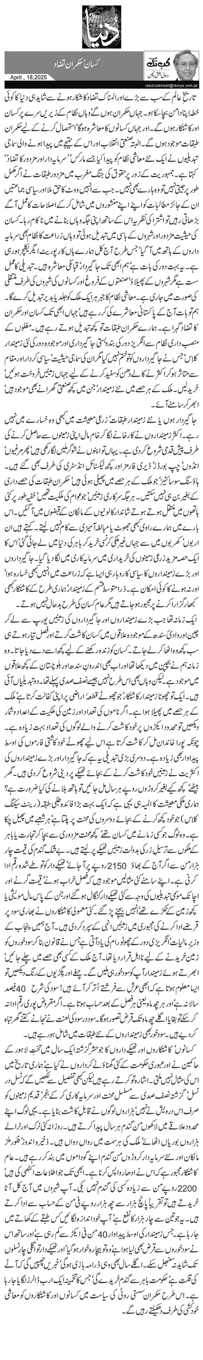تاریخِ عالم کے سب سے بڑے اور المناک تضاد کا شکار ہونے سے شاید ہی دنیا کا کوئی خطہ اپنا دامن بچا سکا ہو۔ جہاں حکمران ہوں گے‘ وہاں نظام کے زیریں سرے پر کسان اور کاشتکار ہوں گے۔ اور جہاں کسانوں کا معاشرہ ہوگا‘ استحصال کرنے کے لیے حکمران طبقات موجود ہوں گے۔ البتہ صنعتی انقلاب اور اس کے نتیجے میں پیدا ہونے والی سماجی تبدیلیوں نے ایک نئے معاشی نظام کو پیدا کیا جسے مارکس ''سرمایہ دار اور مزدور کا تضاد‘‘ کہتا ہے۔ جمہوریت کے زور پر حقوق کی جنگ مغرب میں مزدور طبقات نے اگر مکمل طور پر جیتی نہیں تو وہ ہارے بھی نہیں۔ جب سے انہیں ووٹ کا حق ملا اور سیاسی جماعتیں ان کے جائز مطالبات کو اپنے اپنے منشوروں میں شامل کرکے اصلاحات کا عمل آگے بڑھاتی رہیں تو اشتراکی نظریہ اس کے ساتھ اپنی جگہ وہاں بنانے میں ناکام رہا۔ کسان کی حیثیت مزدور اور شہروں کے باسی میں تبدیل ہوئی تو وہاں زراعت کا نظام بھی سرمایہ داروں کے ہاتھ میں آ گیا‘ جس طرح آج کل ہمارے ہاں کارپوریٹ ایگریکلچر ہو رہی ہے۔ یہ بہت دور کی بات ہے‘ ہم ابھی تک جاگیردار‘ قبائلی معاشرہ ہیں۔ تبدیلی کا عمل سست ہے مگر شہروں کے پھیلاؤ‘ صنعتوں کے فروغ اور کسانوں کی شہروں کی طرف منتقلی کی صورت میں جاری ہے۔ معاشی نظام کا جبر ہر ایک ملک کو جلد یا بدیر تبدیل کرے گا۔ ہم تو بات آج کے پاکستانی معاشرے کی کر رہے ہیں‘ جہاں ابھی تک کسان اور حکمران کا تضاد گہرا ہے۔ ہمارے حکمران طبقات تو کچھ تبدیل ہوتے رہے ہیں۔ مغلوں کے منصب داری نظام سے انگریز دور کی بندوبستی جاگیرداری اور موجودہ دور کی نئی زمیندار کلاس‘ جس نے جاگیرداروں کو تو ختم نہیں کیا مگر ان کی سماجی حیثیت‘ سیاسی کردار اور مقام سے متاثر ہو کر اکثر نے کالے دھن کو سفید کرنے کے لیے جہاں زمینیں فروخت ہوئیں‘ خرید لیں۔ ملک کے ہر حصے میں نئے زمیندار‘ جن میں کچھ صنعتی گھرانے بھی موجود ہیں‘ ابھر کر سامنے آئے۔