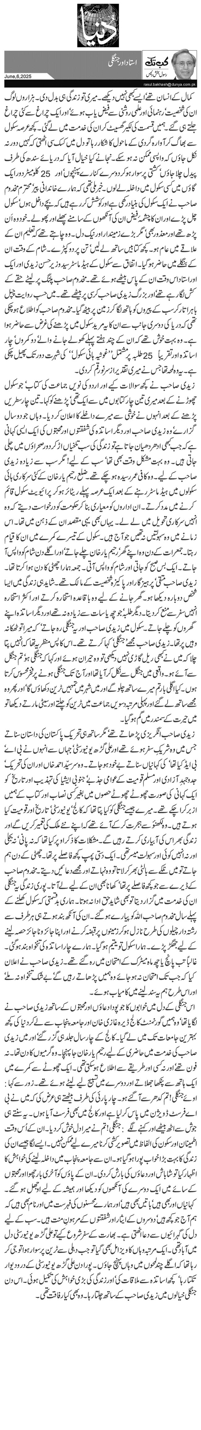 زیدی صاحب انگریزی پڑھاتے تھے‘ مگر ساتھ ہی تحریک پاکستان کی داستان سناتے جس میں وہ شریکِ سفر ہوئے تھے اور علی گڑھ یونیورسٹی‘ جہاں سے انہوں نے بی اے‘ بی ایڈ کیا تھا‘ کی کہانیاں سناتے بے خود ہو جاتے۔ وہ سر سیّد احمد خاں اور ان کی تحریک‘ جدوجہدِ آزادی اور مسلم قومیت کے عوامی جذبے‘ جنوبی ایشیا کی تہذیب اور تاریخ کو ایک کہانی کی صورت چھوٹے چھوٹے حصوں میں بغیر کسی نصاب اور کتاب کے ہمیں ازبر کرا چکے تھے۔ میرے جیسے جنگلی کو کیا پتا تھا کہ کالج‘ یونیورسٹی‘ تاریخ اور قومیت کیا ہوتے ہیں۔ وہ لکھنؤ سے ہجرت کر کے آئے تھے کہ اپنے نئے ملک کی تعمیر کریں گے اور زندگی بھر اس کی آبیاری کرتے رہیں گے۔ مشکلات کا ذکر اوپر کیا تھا کہ نہ پانی‘ نہ بجلی اور نہ انہیں کوئی اور سہولت میسر تھی۔ ایک دستی پمپ کچھ فاصلے پر تھا۔ چھٹی کے دن ہم جاتے تو میں نلکے سے بالٹی بھر کر لاتا تو وہ نہاتے اور مجھے دعائیں دیتے۔ مخدوم صاحب کے ڈیرے سے جو کچھ فاصلے پر تھا‘ کھانا بھی ان کے لیے لے آتا۔ پوری زندگی یہ جنگلی ان کی خدمت میں گزار دیتا تو بھی شاید حق ادا نہ ہوتا۔ ہماری بدقسمتی کہ سکول کھلنے کے پہلے سال مخدوم صاحب اللہ کو پیارے ہو گئے۔ ان کی آنکھ بند ہوتے ہی ہر طرف سے رشتہ دار چیلوں کی طرح نازل ہوکر زمینوں پر قبضہ کرنے اور اپنا جائز وناجائز حصہ لینے کے لیے جھگڑ پڑے۔ ہمارا سکول تو یتیم ہو گیا۔ ہمارے چار اساتذہ کی تنخواہ بند ہو گئی۔ غالباً تب پانچ یا چھ ماہ میٹرک کے امتحان میں رہ گئے تھے۔ زیدی صاحب نے اعلان کیا کہ جب تک امتحان نہ ہو جائے وہ ہمیں پڑھاتے رہیں گے‘ بے شک تنخواہ نہ ملے‘ اور اس طرح ہم یہ سند لینے میں کامیاب ہوئے۔