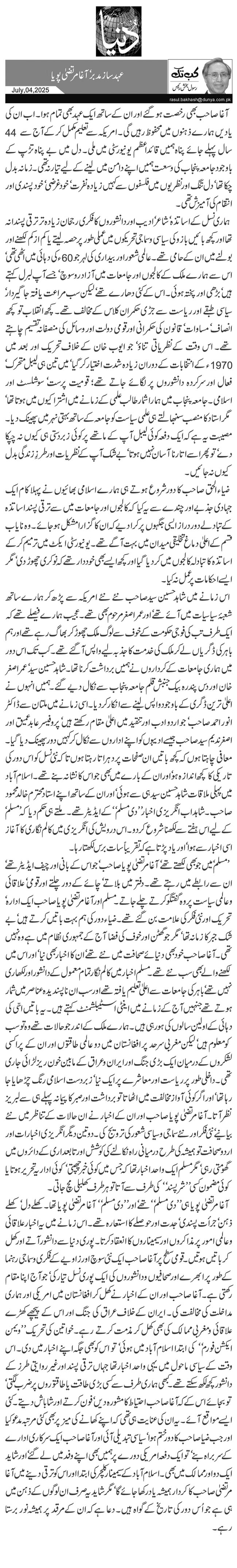 آغا مرتضیٰ پویا ہی ''دی مسلم‘‘ تھے‘ اور ''دی مسلم‘‘ آغا مرتضیٰ پویا تھا۔ کھلے دل‘ کھلے ذہن‘ جرأت پسندی‘ جدت اور حوصلے کا استعارہ تھے۔ اس زمانے میں یہ اخبار علاقائی وعالمی امور پر مذاکروں اور سیمیناروں کا انعقاد کرتا۔ پوری دنیا سے دانشور آتے اور کھل کر باتیں ہوتیں۔ قومی سطح پر آغا صاحب ایک نئی سوچ اور زاویے کے فکری وسماجی رہنما کے طور پر ابھرے اور صحافیوں ودانشوروں کی ایک پوری نسل تیار کی‘ جو آج اپنا مقام رکھتی ہے۔ آغا صاحب اور ان کے اخبار نے کھل کر افغانستان میں امریکی اور ہماری مداخلت کی مخالفت کی۔ ایران کے خلاف عراق کی جنگ اور اس کے پیچھے کھڑے علاقائی ومغربی ممالک کی بھی کھل کر مذمت کرتے رہے۔ خواتین کی تحریک ''ویمن ایکشن فورم‘‘ کی ابتدا اسلام آباد میں ہوئی‘ تو اس کو بھی جگہ اپنے اخبار میں دی۔ اس وقت کے سیاسی ماحول میں یہی واحد اخبار تھا جہاں ترقی پسند اور غیر روایتی طرز کے دانشور کچھ لکھ سکتے تھے۔ کبھی ہماری طرف سے کسی بڑی طاقت یا طاقتوروں پر ضرب لگتی‘ تو بجائے اس کے کہ آغا صاحب احتیاط کا مشورہ دیں‘ فون کرتے اور شاباش دیتے۔ کئی ایسے مواقع آئے۔ یہ ان کی عنایت ہی تھی کہ اپنے کھانے کی میز پر بھی کئی مرتبہ مدعو کیا اور جب ضیا صاحب کا دور ختم ہوا‘ سیاسی تبدیلی آئی اور آغا صاحب ایک سرکاری ادارے کے سربراہ بنے‘ تو ایک دفعہ امریکی دورے پر ہمیں بھی اپنے وفد میں لے گئے‘ اور شاید ایک دو اور ممالک میں بھی۔ اسلام آباد کے سیمینار کلچر کی ابتدا اور اس کو ترقی دینے میں آغا مرتضیٰ صاحب کا کردار ہمیشہ یاد رکھا جائے گا‘ مگر شاید یہ صرف ان لوگوں کے ذہن میں ہی ہے جو اُس دور کی تاریخ کے گواہ ہیں۔ دعا ہے کہ ان کے مرقد پر ہمیشہ نور برستا رہے۔