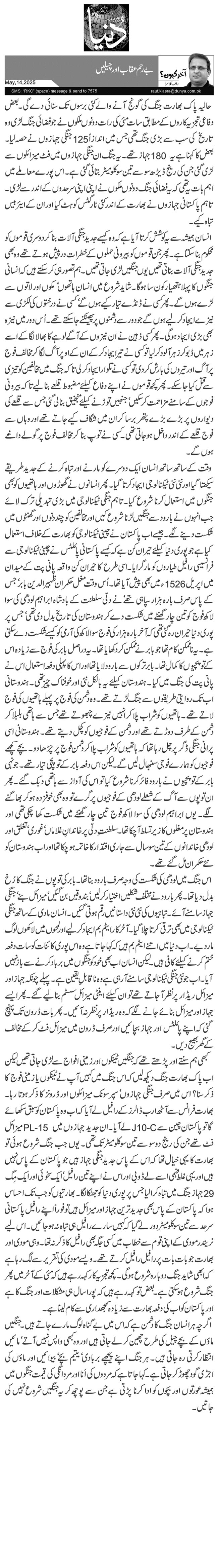 حالیہ پاک بھارت جنگ کی گونج آنے والے کئی برسوں تک سنائی دے گی۔ بعض دفاعی تجزیہ کاروں کے مطابق سات مئی کی رات دونوں ملکوں نے جو فضائی جنگ لڑی وہ تاریخ کی سب سے بڑی جنگ تھی جس میں اندازاً 125جنگی جہازوں نے حصہ لیا۔ بعض کا کہنا ہے یہ 180 جہاز تھے۔ یہ جنگ ان جنگی جہازوں میں فٹ میزائلوں سے لڑی گئی جن کی رینج ڈیڑھ سو سے تین سو کلومیٹر بتائی گئی ہے۔ اس پورے معاملے میں اہم بات یہ تھی کہ یہ فضائی جنگ دونوں ملکوں نے اپنی اپنی سرحدوں کے اندر سے لڑی۔ تاہم پاکستانی جہازوں نے بھارت کے اندر کئی ٹارگٹس کو ہٹ کیا اور ان کے ایئر بیس تباہ کیے۔