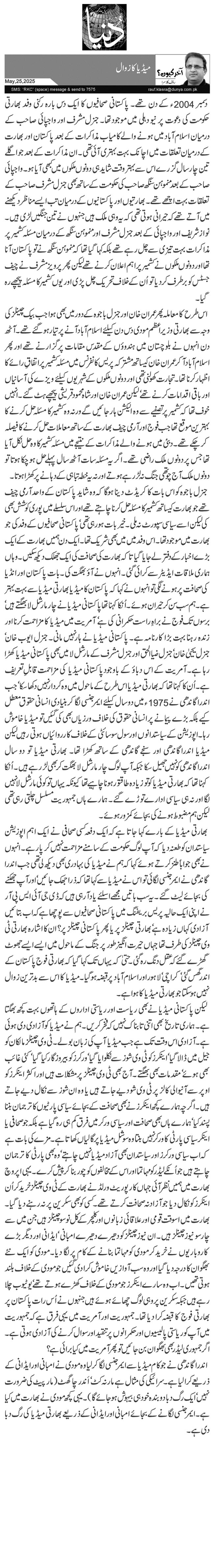 اندرا گاندھی نے جو کام میڈیا سے ایمرجنسی لگا کر لیا وہ مودی نے امبانی اور ایڈانی کے ذریعے کرا لیا ہے۔ سرائیکی کی مثال ہے مار نہ کٹ‘ اَندر چا گھٹ( مار پیٹ کی ضرورت نہیں‘ ایک رگ دبا دو بندہ خود ہی بیہوش ہو جائے گا)۔ یہی کچھ مودی نے بھارت میں کیا ہے۔ ایمرجنسی لگانے کے بجائے امبانی اور ایڈانی کے ذریعے بھارتی میڈیا کی رگ دبا دی ہے۔