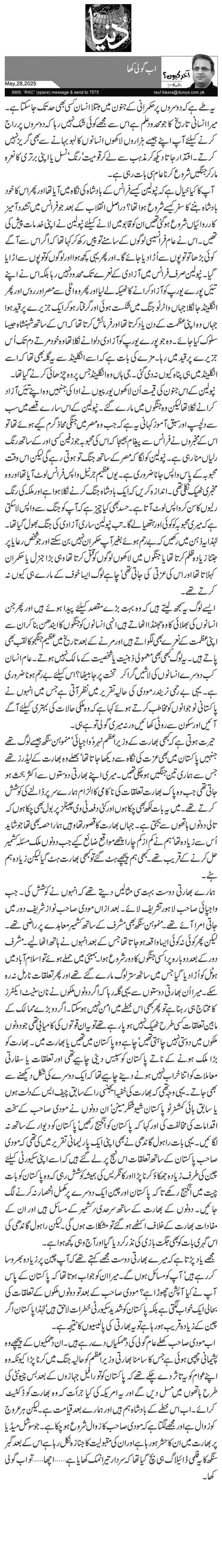 اب مودی صاحب کھلے عام گولی کی دھمکیاں دے رہے ہیں۔ ان دھمکیوں کے پیچھے وہ پشیمانی چھپی ہوئی ہے جس کا سامنا بھارتی وزیراعظم کو حالیہ جنگ میں کرنا پڑا کیونکہ وہ اپنے عوام کو یہ تاثر دے چکے تھے کہ پاکستان کو تو رافیل جہازوں کے بعد بس چیونٹی کی طرح ہاتھوں میں مسل دیں گے اور یہ امریکہ کی کیا جرأت کہ وہ بھارت کو ڈکٹیٹ کرائے۔ اب اس خطے کے بادشاہ ہم ہیں اور ہمارے بعد قیامت ہے۔ لیکن ہر عروج کو زوال ہے اور مجھے لگتا ہے کہ مودی صاحب کا زوال شروع ہو چکا ہے۔ جو سوشل میڈیا پر بھارت میں ان کا حشر ہو رہا ہے اور ان کی مقبولیت کا جنازہ نکل رہا ہے اس کے بعد گبر سنگھ کا یہ فلمی ڈائیلاگ ہی بچ گیا تھا کہ سردار تیرا نمک کھایا ہے... اچھا... تو اب گولی کھا۔