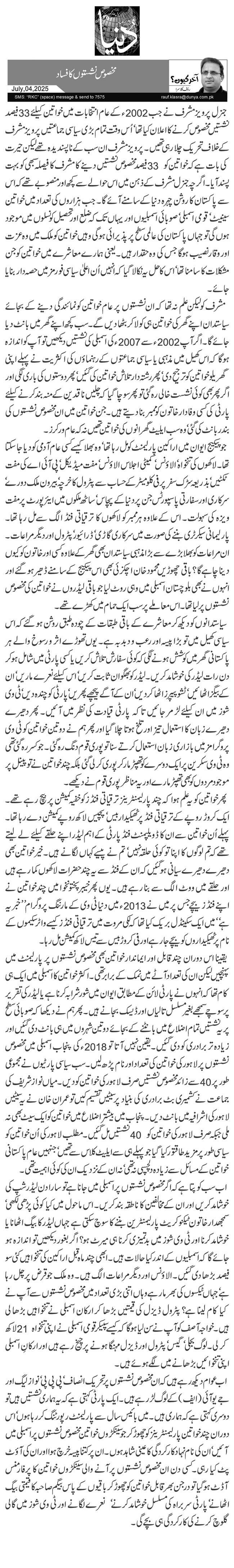 مشرف کو لیکن علم نہ تھا کہ ان نشستوں پر عام خواتین کو نمائندگی دینے کے بجائے سیاستدان اپنے گھر کی خواتین ہی کو لا کر بٹھا دیں گے۔ سب کچھ اپنے گھر میں بانٹ دیا جائے گا۔ اگر آپ 2002ء سے 2007ء کی اسمبلی کی نشستیں دیکھیں تو آپ کو اندازہ ہو گا کہ اس کھیل میں مذہبی یا سیاسی جماعتوں کے رہنماؤں کی اکثریت نے پہلے اپنی گھریلو خواتین کو ترجیح دی‘ پھر رشتہ دار تلاش خواتین کی گئیں‘ پھر دوستوں کی باری لگی اور اگر پھر بھی کوئی نشست خالی رہ گئی تو پھر سوچا گیا کہ چلیں ناقدین کے منہ بندکرنے کیلئے پارٹی کی کسی وفادار خاتون کو ممبر بنا دیتے ہیں۔ جن خواتین میں ان مخصوص نشستوں کی بندر بانٹ کی گئی‘ وہ سب ایلیٹ گھرانوں کی خواتین تھیں نہ کہ عام ورکرز۔