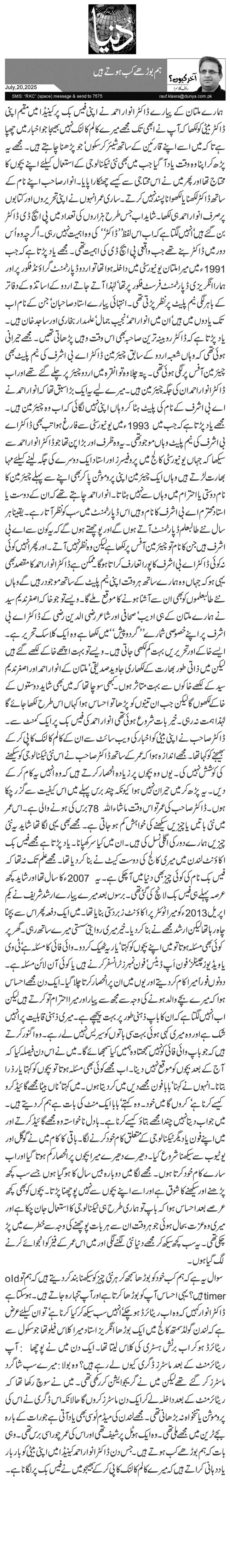 سوال یہ ہے کہ ہم کب خود کو بوڑھا سمجھ کر ہر نئی چیز کو سیکھنا بند کر دیتے ہیں کہ ہم تو old timer ہیں؟ یہی احساس آپ کو بوڑھا کرتا ہے اور آپ تنہا رہ جاتے ہیں۔ ہوسکتا ہے ڈاکٹر انوار کہیں کہ وہ اب ریٹائرڈ ہوچکے‘ انہیں سب سیکھ کر کیا کرنا ہے‘ تو ان کیلئے عرض ہے کہ لندن گولڈ سمتھ کالج میں ایک بوڑھا انگریز استاد میرا کلاس فیلو تھا جو سکول سے ریٹائرڈ ہو کر اب برٹش ہسٹری کی کلاس لیتا تھا۔ ایک دن میں نے پوچھا: آپ ریٹائرمنٹ کے بعد ماسٹرز ڈگری کیوں لے رہے ہیں؟ وہ بولا :میرے سب شاگرد ماسٹرز کر گئے تھے لیکن میں نے گریجوایشن کررکھی تھی۔ میں نے سوچ رکھا تھا کہ ریٹائرمنٹ کے بعد داخلہ لے کر ایک دن ماسٹرز کروں گا حالانکہ اس ڈگری نے اس کی پروموشن یا تنخواہ نہ بڑھانی تھی۔ مجھے لندن کی میڈم لُوسی بھی یاد آتی ہے جو رات کے بارہ بجے ٹرین میں مجھے ملی تھی ۔وہ ایک ہوٹل پر شیف تھی اور اس کی عمر چوراسی برس تھی۔ وہی بات کہ ہم بوڑھے کب ہوتے ہیں۔ جس دن ڈاکٹر انوار احمد کینیڈا میں اپنی بیٹی کو بار بار یاد دہانی کراتے ہیں کہ میرے کالم کا لنک کاپی کر کے بھیجو میں نے فیس بک پر لگانا ہے۔