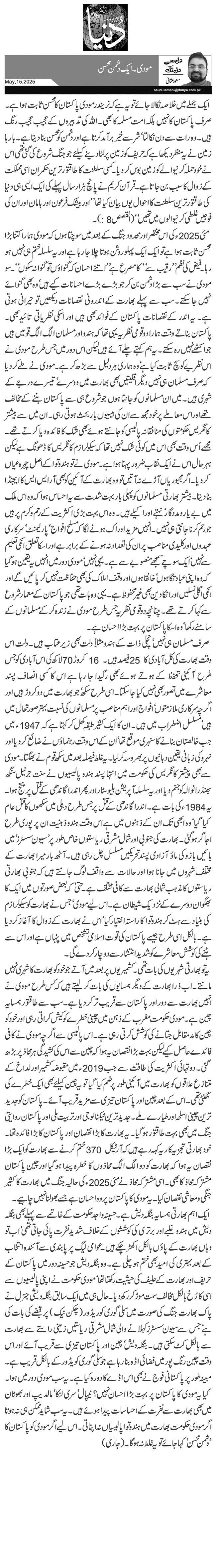 مئی 2025ء کی اس مختصر اور محدود جنگ کے بعد میں سوچتا ہوں کہ مودی ہمارا کتنا بڑا محسن ثابت ہوا ہے تو ایک ایک پہلو روشن ہوتا چلا جا رہا ہے اور یہ سلسلہ ختم ہی نہیں ہو رہا۔ فیض کی نظم ''رقیب سے‘‘ کا مصرع ہے ''اتنے احسان کہ گنوائوں تو گنوا نہ سکوں‘‘۔ سو مودی نے سب سے بڑا دشمن بن کر جو بڑے بڑے احسانات کیے ہیں‘ وہ بھی گنوائے نہیں جا سکتے۔ سب سے پہلے بھارت کے اندرونی نقصانات دیکھیں تو حیرانی ہوتی ہے۔ یہ اندر کے نقصانات پاکستان کے فوائد بھی ہیں اور اسکی نظریاتی تائید بھی۔ پاکستان بناتے وقت ہمارا دو قومی نظریہ یہی تھا کہ ہندو اور مسلمان الگ الگ قومیں ہیں جو اکٹھے نہیں رہ سکتے۔ یہ ہم کہتے چلے آئے ہیں لیکن اس دور میں جس طرح مودی نے اس نظریے کو سچ ثابت کیا ہے‘ وہ ہماری ہر دلیل سے بڑھ کر ہے۔ مود ی نے طے کر دیا کہ صرف مسلمان ہی نہیں دیگر اقلیتیں بھی بھارت میں دوسرے‘ تیسرے درجے کے شہری ہیں۔ میں ان مسلمانوں کو جانتا ہوں جو شروع ہی سے پاکستان بننے کے مخالف تھے اوراس معاملے پر خود مجھ سے ان کی بیسیوں بار بحث ہوتی رہی۔ ان میں سے بیشتر کانگریس حکومتوں کی منافقانہ پالیسی کو جانتے ہوئے بھی شک کا فائدہ دیا کرتے تھے۔ مجھے اُس وقت بھی اس میں کوئی شک نہیں تھا کہ سیکولرازم کانگریس کا ڈھونگ ہے لیکن بہرحال اس نے ایک نقاب ضرور پہنا ہوا ہے۔ مودی نے تو ہندوتوا کے اصل چہرہ عیاں کر دیا۔ اگر مجبوریاں آڑے نہ آتیں تو وہ بھارت کے آئین کو بھی آر ایس ایس کا ایجنڈا بنا دیتا۔ بیشتر بھارتی مسلمانوں کو پہلی بار بہت شدت سے یہ احساس ہوا کہ وہ اس ملک میں بے یار ومددگار‘ نہتے اور اکیلے ہیں۔ وہ اس بہت بڑی اکثریت کے رحم وکرم پر ہیں جو رحم کرنا جانتی ہی نہیں۔ انہیں مزید ادراک ہونے لگا کہ مسلح افواج‘ پارلیمنٹ‘ سرکاری عہدوں اور کلیدی مناصب پر ان کی تعداد نہ ہونے کے برابر ہے اور اسکا تعلق انکی تعلیم سے نہیں‘ ایک سوچے سمجھے منصوبے سے ہے۔ یہی نہیں‘ مودی دور میں انہیں یہ یقین ہو گیا کہ وہ اپنی عبادتگاہوں‘ خانقاہوں اور وقف املاک کی بھی حفاظت نہیں کر پائیں گے اور انکی اگلی نسلیں اور انکا دین بھی غیر محفوظ ہے۔ یہی وہ بات تھی جو پاکستان کے معمار شروع سے کہا کرتے تھے۔ چنانچہ دو قومی نظریہ جس طرح مودی نے زندہ کر کے مسلمانوں کے سامنے رکھا‘ وہ اسکا پاکستان پر بہت بڑا احسان ہے۔