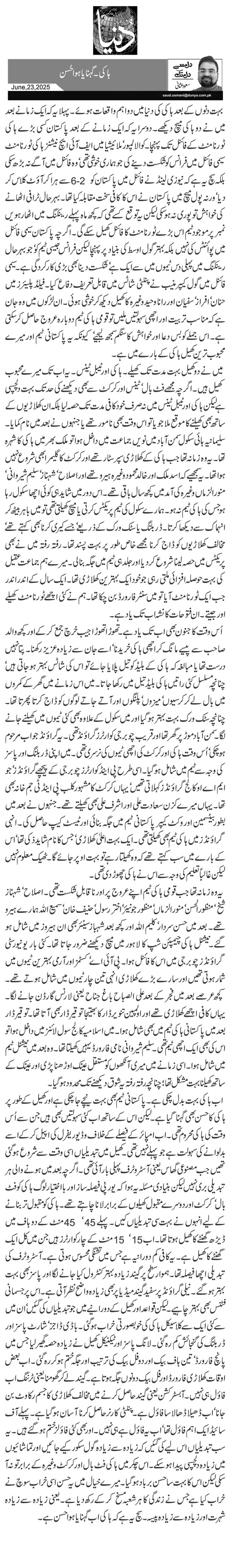 یہ وہ زمانہ تھا جب قومی ہاکی ٹیم اپنے عروج پر اور ناقابلِ شکست تھی۔ اصلاح‘ شہناز شیخ‘ منظور الحسن‘ منور الزماں‘ منظور جونیئر‘ اختر رسول‘ حنیف خان‘ سمیع اللہ ہمارے ہیرو تھے۔ بعد میں حسن سردار‘ کلیم اللہ اور کچھ بعد شہباز سینئر بھی ان ہیروز میں شامل ہو گئے۔ نیشنل ہاکی چیمپئن شپ کا لاہور میں میچ دیکھنے ضرور جاتا تھا۔ کئی بار یونیورسٹی گرائونڈز چوبرجی میں اس کا فائنل ہوا۔ پی آئی اے‘ کسٹمز اور آرمی بہترین ٹیموں میں شمار ہوتی تھیں اور سارے بڑے کھلاڑی انہی تین چار ٹیموں میں شامل ہوتے تھے۔ کچھ عرصے بعد میں فجر کے بعد علی الصباح باغ جناح یعنی لارنس گارڈن جانے لگا۔ یہاں کافی اچھے کھلاڑی تھے اور اولمپین تنویرڈار کا بھتیجا توقیر ڈار بھی آتا تھا۔ توقیر ڈار بعد میں پاکستانی ہاکی ٹیم میں بھی شامل ہوا۔ میں اسلامیہ کالج سول لائنز میں داخل ہوا تو اس کی بھی ایک اچھی ٹیم تھی۔ سلیم شیروانی نامی فارورڈ یہیں کھیلتا تھا۔ وہ بعد میں نیشنل ٹیم میں شامل ہوا۔ اسی زمانے میں میری آنکھوں کو مستقل عینک اوڑھنا پڑی اور عینک کے ساتھ کھیلنا بہت مشکل تھا؛ چنانچہ رفتہ رفتہ یہ شوق دیکھنے تک محدود ہو گیا۔