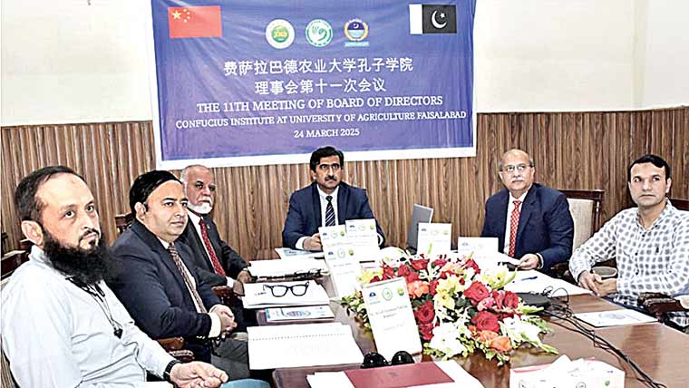 تاکہ ایک دوسرے کے تجربات سے مستفید ہوتے ہوئے مشترکہ چیلنجز سے نمٹنے میں مدد مل سکے ۔ اس امر پر اتفاق یونیورسٹی میں قائم چائینز کنفیوشس انسٹی ٹیوٹ کے 11ویں بورڈ آف ڈائریکٹرز کے اجلاس کے دوران کیا گیا۔ زرعی یونیورسٹی فیصل آباد کے وائس چانسلر پروفیسر ڈاکٹر ذوالفقار علی نے اجلاس کی صدارت کی جبکہ ژنگ جیانگ زرعی یونیورسٹی چین کے صدر پروفیسر ڈاکٹر جیانگ پنگان (آن لائن) نے بھی اس موقع پر خطاب کیا۔پروفیسر ڈاکٹر جیان پنگان نے زرعی یونیورسٹی کے ماہرین کی ٹیم کو ژنگ جیانگ زرعی یونیورسٹی چین کا دورہ کرنے کی دعوت دی جس سے تعلقات میں مزید وسعت آئے گی۔ انہوں نے کہا کہ گیارہ سال پہلے ہم نے زرعی یونیورسٹی فیصل آباد میں کنفیوشس انسٹی ٹیوٹ کو قائم کرنے کے لئے معاہدہ طے پایا تھا اور گزشتہ گیارہ سالوں میں انسٹی ٹیوٹ نے چینی ثقافت کے فروغ، زبان کی تعلیم، علمی تعاون اور اساتذہ اور طلباء کے تبادلے میں نتیجہ خیز کامیابیاں حاصل کی ہیں۔ انہوں نے ڈاکٹر ذوالفقار علی کو وائس چانسلر کا چارج سنبھالنے پر مبارکباد دی۔ڈاکٹر ذوالفقار علی نے کہا کہ کنفیوشس انسٹی ٹیوٹ نے چینی زبان، ثقافت کے فروغ کے ذریعے باہمی افہام و تفہیم اور احترام کو فروغ دینے میں اہم کردار ادا کیا ہے ۔ انہوں نے کہا کہ یہ ادارہ پاکستان اور چین کے تعلقات کو مزید گہرا کرنے میں معاون ثابت ہوا ہے ۔