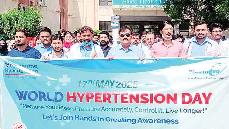 جس کی قیادت پروفیسر ڈاکٹر عامر شوکت اور ڈاکٹر محمد عرفان نے کی۔ واک الائیڈ ہسپتال سے شروع ہو کر جیل روڈ تک گئی، جس میں سینکڑوں ڈاکٹرز اور میڈیکل طلبہ نے شرکت کی۔ شرکاء نے ایسے بینرز اور پلے کارڈ اٹھا رکھے تھے جن پر بلند فشار خون سے بچاؤ کے طریقے درج تھے ۔ اختتامی تقریب سے خطاب کرتے ہوئے پروفیسر ڈاکٹر عامر شوکت نے کہا کہ بلڈ پریشر سے بچاؤ کے لیے روزانہ 30 منٹ واک، مرغن غذاؤں، سگریٹ نوشی اور زیادہ نمک کے استعمال سے پرہیز اور پھل و سبزیاں کھانا ضروری ہے ۔ ڈاکٹر محمد عرفان کے مطابق دنیا بھر میں ایک ارب 28 کروڑ افراد ہائی بلڈ پریشر میں مبتلا ہیں، جن میں سے سالانہ ایک کروڑ افراد اس کی پیچیدگیوں کے باعث جان سے ہاتھ دھو بیٹھتے ہیں۔