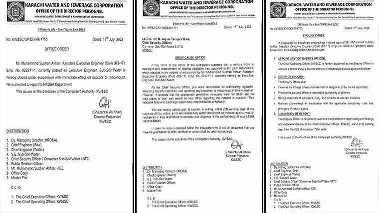 تفصیلات کے مطابق کراچی واٹر کارپوریشن کے انجینئر محمد سبحان اختر کے خلاف محکمانہ انکوائری کا باضابطہ آغاز کر دیا گیا ہے ۔ واٹر کارپوریشن انتظامیہ نے انجینئر محمد سبحان کو بغیر اجازت سب سوائل لائسنس جاری کرنے پر فوری معطل کر دیاہے ۔ انجینئر پر الزام ہے کہ انہوں نے سیکیورٹی افسر کی غیر مجاز منظوری پر سب سائل واٹر کا پرمٹ جاری کیا،اس کے ساتھ ساتھ چیف سیکیورٹی آفیسر و کنوینر سب سائل واٹر کمیٹی لیفٹیننٹ کرنل (ر)ایم انجم توقیر ملک کو شوکاز نوٹس جاری کردیا گیا۔ سیکیورٹی آفیسر پر سیکیورٹی پروٹوکول کی خلاف ورزی، نگرانی میں ناکامی اور اطلاع نہ دینے کے الزامات عائد کئے گئے ہیں۔ چیف سیکیورٹی آفیسر کو تین روز میں وضاحت پیش کرنے کی ہدایت کی گئی ہے ،بصورت دیگر محکمانہ کارروائی کا عندیہ دیا گیا ہے ۔ معطل انجینئر کو فوری طور پر ہیومن ریسورس ڈیپارٹمنٹ میں رپورٹ کرنے کا حکم جاری کیا گیا ہے ۔کراچی واٹر کارپوریشن کے چیف آپریٹنگ آفیسر کو محکمانہ انکوائری افسر مقرر کیا گیا ہے ۔ انکوائری افسر کو 15 دن میں رپورٹ تیار کر کے چیف ایگزیکٹو آفیسر کو پیش کرنے کی ہدایت کی گئی ہے ۔ انکوائری میں الزامات کی جانچ، ملزم کو صفائی کا موقع، گواہوں کے بیانات اور تمام شواہد کا جائزہ شامل ہوگا ۔واٹر کارپوریشن نے تمام کارروائی ضابطہ اخلاق اور قدرتی انصاف کے اصولوں کے مطابق مکمل کرنے کا حکم دیا۔