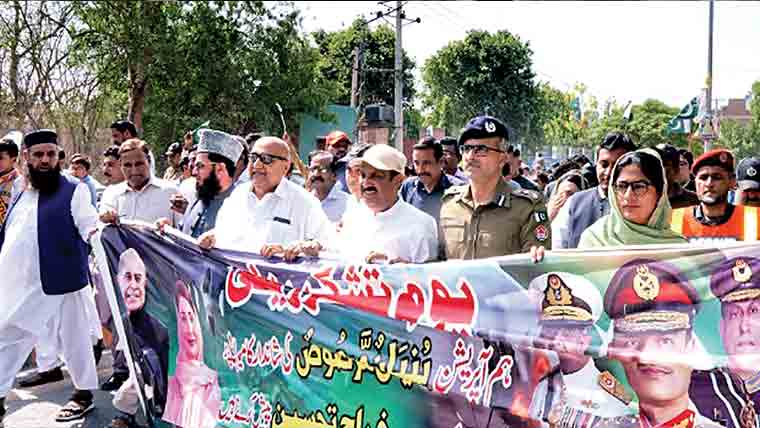 قومی سلامتی کی دعاؤں سے کیا گیا۔ بھارتی عزائم خاک میں ملانے پر نڈر لیڈر شپ،دلیر افواج اور پاکستانی قوم یک دل ویک جان،وطن عزیز کے کامیاب دفاع پر افواج پاکستان کو خراج تحسین، ضلع کونسل ہال میں پرچم کشائی کی تقریب منعقد ہوئی،پولیس گارڈز نے سلامی دی۔ضلعی انتظامیہ کے زیراہتمام یوم تشکر پر شاندار ریلی نکالی گئی۔مرکزی ریلی ضلع کونسل ہال سے ایس پی چوک تک نکالی گئی۔ڈپٹی کمشنر ڈاکٹر سلمیٰ،ڈی پی او اسماعیل کھاڑک،پارلیمانی سیکرٹری رانا سلیم حنیف نے ریلی کی قیادت کی۔ایڈیشنل ڈپٹی کمشنر غلام مصطفیٰ سیہڑ،اسسٹنٹ کمشنر سنبل جاوید ودیگر افسران،سیاسی قائدین،صحافی،وکلاء ،تاجر برادری،ممبران امن کمیٹی، علمائے کرام،سول سوسائٹی سمیت طلباء کی کثیر تعداد نے ریلی میں شرکت کی۔پاک افواج کے سربراہوں،جوانوں اور شہداء کو شاندار الفاظ میں خراج تحسین پیش کیا گیا۔ڈپٹی کمشنر ڈاکٹر سلمیٰ سلیمان نے ریلی سے خطاب کرتے ہوئے کہا کہ شاندار فتح پر پوری قوم مبارکباد کی مستحق ہے ،ہمارے اتحاد سے 8گنا بڑے دشمن کو منہ کی کھانا پڑی ہے ،فضائی برتری ختم ہونے پر دشمن کے خواب چکناچور ہوگئے ہیں۔،دشمن زخم چاٹنے پر مجبور ہے ،بھارتی جارحیت سے ہمارے اپنے اختلافات بھی دور ہوگئے ہیں۔پارلیمانی سیکرٹری کمیونیکیشن اینڈ ورکس رانا سلیم حنیف نے کہا کہ ہماری مسلح افواج نے دشمن انڈیا کو شکست دی،اور اس کا غرور خاک میں ملادیا،افواج پاکستان اور سیاستدانوں کی کمال مہارت سے ہم نے شاندار کامیابی سمیٹی ہے ۔ڈی پی او اسماعیل کھاڑک نے کہا کہ بھارتی جارحیت کو پسپا کرنے کا کریڈٹ ہماری مسلح افواج کو جاتا ہے ،پاک افواج نے ایک بار پھر لازوال داستان رقم کی ہے ۔خانیوال کی تحصیلوں میانچنوں،جہانیاں،کبیروالا میں اسسٹنٹ کمشنرز کی زیر نگرانی پرچم کشائی اور پاک افواج کو خراج تحسین پیش کرنے کیلئے ریلیاں بھی نکالی گئیں۔ ۔