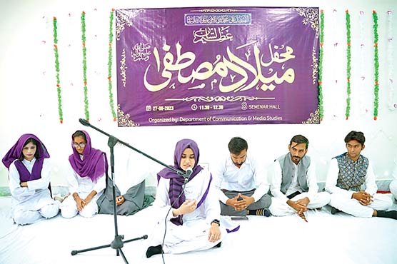 اور طلبہ کی طرف سے آنحضو ر ؐ کی بارگاہ میں نعتِ شریف اور درود پاک کے نذرانے پیش کیے گئے ۔ ثناء خوانِ رسول نے رحمت ِدوجہاں کے حضور انتہائی عاجزی اور انکساری کے ساتھ نذرانہ عقیدت پیش کرتے ہوئے عشقِ مصطفیؐ کااظہارکیا۔محفل میلاد میں ، اسسٹنٹ پروفیسر نعمان یاسر،اسسٹنٹ پروفیسرڈاکٹر مدثر حسین شاہ، اسسٹنٹ پروفیسر ڈاکٹر عبد الرحمن قیصر سمیت دیگر فیکلٹی ممبران اور طلبہ کی کثیر تعداد نے شرکت کی۔