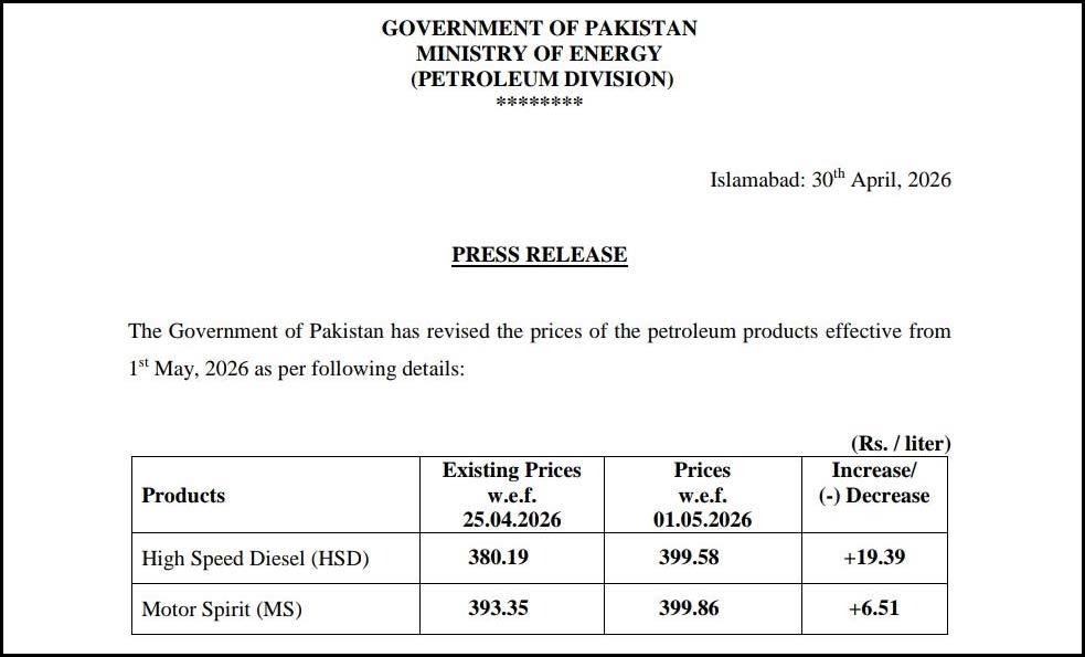 اضافے کے بعد پٹرول کی نئی قیمت 399 روپے 86 پیسے اور ڈیزل کی نئی قیمت 399 روپے 58 پیسے فی لٹر مقرر کی گئی ہے۔