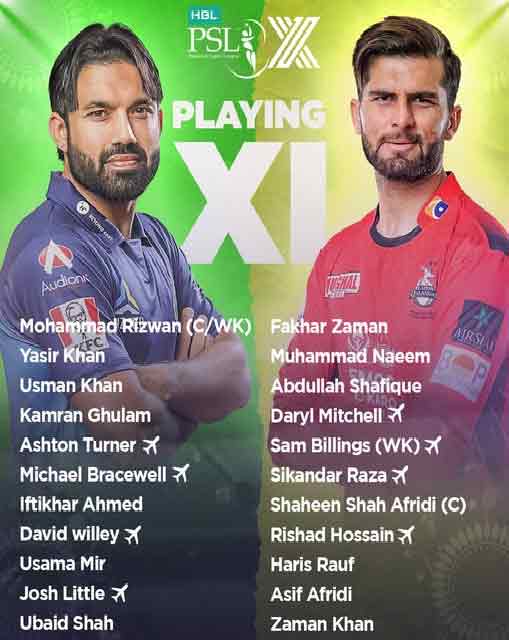 دونوں ٹیموں کے درمیان میچ ملتان کرکٹ سٹیڈیم میں آج رات 8 بجے شروع ہوا جہاں ملتان سلطانز کی قیادت رضوان اور لاہور قلندرز کو شاہین آفریدی لیڈ کررہے ہیں۔