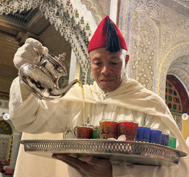 ایک اور منظر مراکش کی مہمان نوازی کو اجاگر کرتا ہے، جہاں روایتی پودینے کی چائے پیش کیے جانے کا لمحہ قید کیا گیا ہے، رسمی لباس میں ملبوس ایک خادم نقش و نگار والے چاندی کے کیتلی سے رنگین گلاسوں میں چائے انڈیل رہا ہے، پس منظر میں نفیس ٹائلوں سے مزین اندرونی حصے دکھائی دیتے ہیں۔