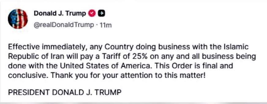 ٹرمپ نے اپنے پیغام میں ایران کے ساتھ تجارت کرنے والے ممالک پر 25 فیصد ٹیرف لگانے کا اعلان کرتے ہوئے لکھا کہ اس اضافی ٹیرف کا اطلاق فوری طور پر ہوگا، ان کا مزید کہنا تھا کہ فیصلہ حتمی ہے اس میں کوئی تبدیلی نہیں ہوگی۔