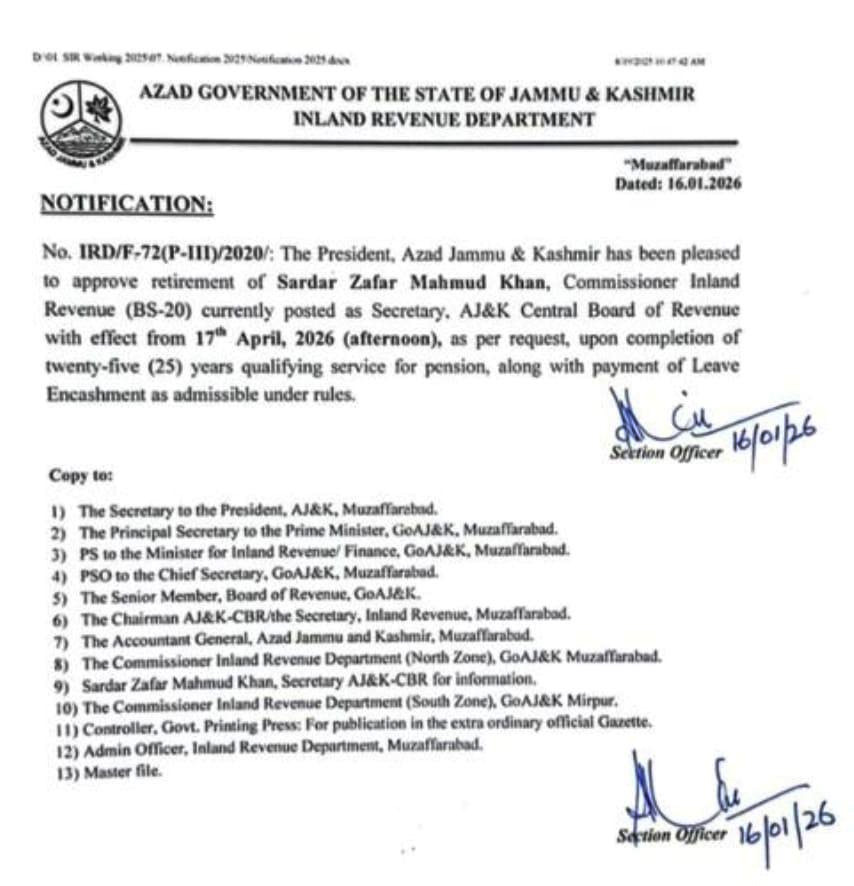 آزاد کشمیر میں گریڈ 21 کے افسر کا خلاف قواعد ریٹائرمنٹ نوٹیفکیشن جاری