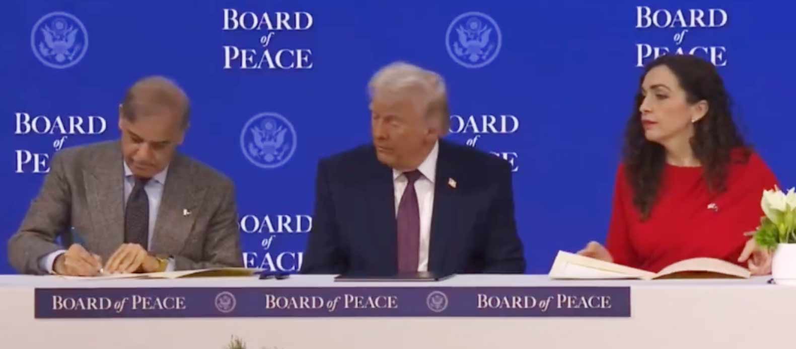 سوئٹزرلینڈ کے شہر ڈیووس میں ورلڈ اکنامک فورم کے 56 ویں سالانہ اجلاس کے موقع پر غزہ بورڈ آف پیس پر دستخط کئے گئے، پاکستان بھی بورڈ آف پیس کا حصہ ہوگا، پاکستان کی طرف وزیراعظم محمد شہباز شریف نے دستخط کیے، اس موقع پر شہباز شریف اور ٹرمپ کے درمیان سرگوشیاں بھی تقریب کا خاص لمحہ بن گئیں۔