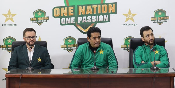 پی سی بی سلیکشن کمیٹی کے ڈائریکٹر عاقب جاوید، ہیڈ کوچ مائیک ہیسن اور وائٹ بال کپتان سلمان آغا پریس کانفرنس کرتے ہوئے ٹی 20 ورلڈکپ کیلئے قومی ٹیم کا اعلان کیا۔