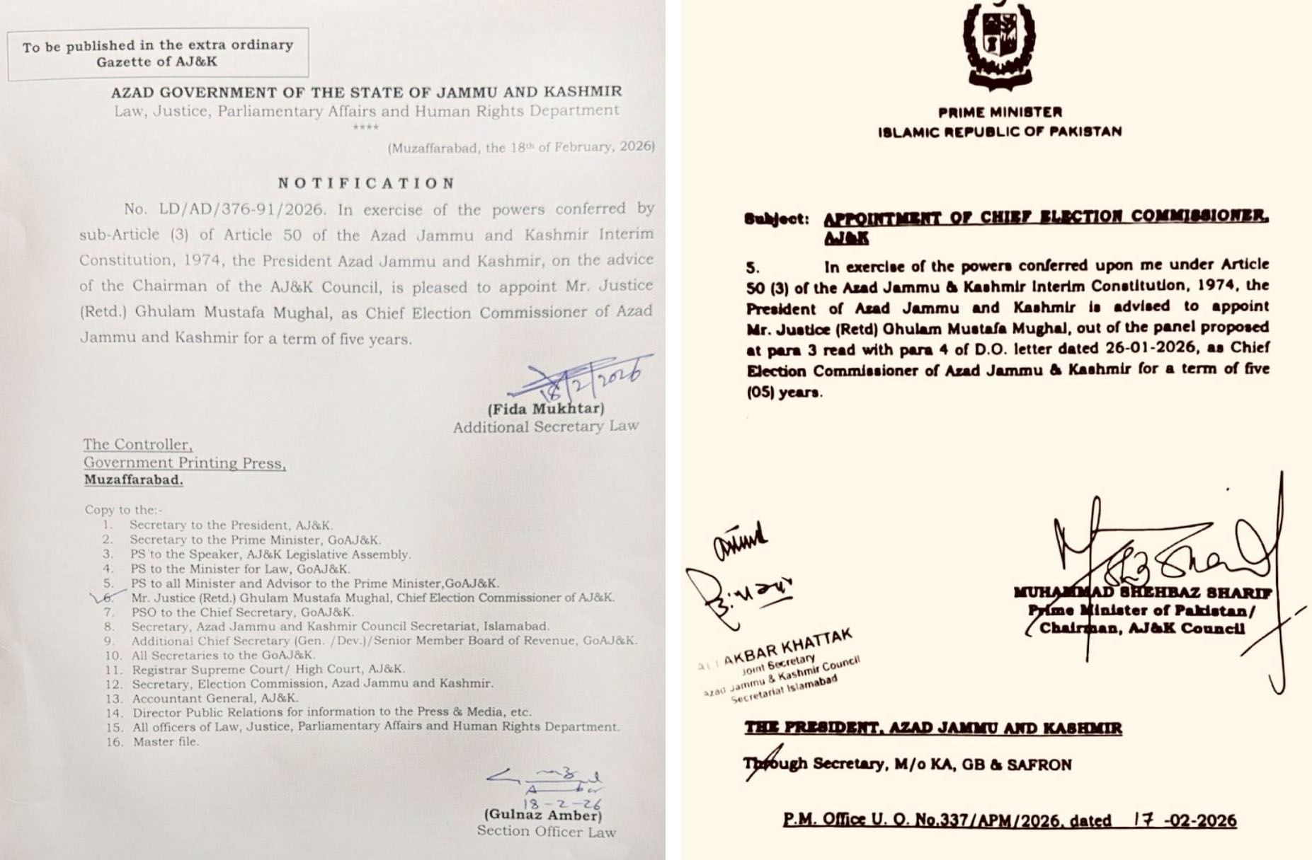 وزارت قانون و انصاف و پارلیمانی امور کی جانب سے جاری نوٹیفکیشن کے مطابق تقرری صدر آزاد جموں و کشمیر کے حکم پر عمل میں لائی گئی، چیف الیکشن کمشنر کا عہدہ گزشتہ سال 13 جنوری سے خالی تھا، جب سابق چیف الیکشن کمشنر جسٹس عبدالرشید سلہریا کی مدت مکمل ہوئی تھی۔
