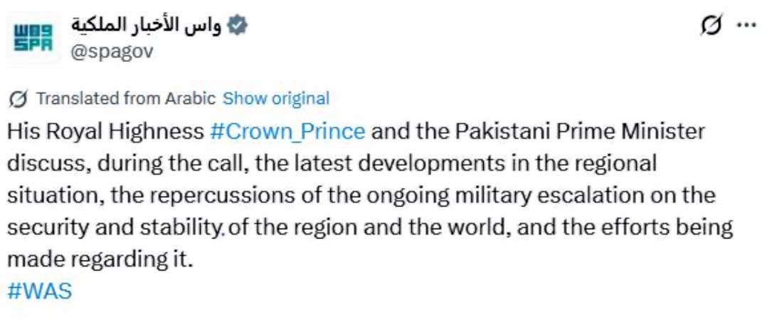 وزیراعظم شہباز شریف اور سعودی ولی عہد محمد بن سلمان کے درمیان رابطے میں عالمی و علاقائی امن و استحکام کیلئے جاری کوششوں پر تبادلہ خیال کیا گیا، وزیراعظم نے سعودی عرب سے مکمل یکجہتی کا اظہار کیا۔