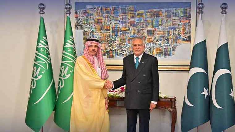 قبل ازیں سعودی وزیرخارجہ شہزادہ فیصل بن فرحان کی پاکستانی وزارت خارجہ پہنچ گئے۔ نائب وزیر اعظم اسحاق ڈار نے وزیر خارجہ شہزادہ فیصل بن فرحان السعود کا استقبال کیا۔