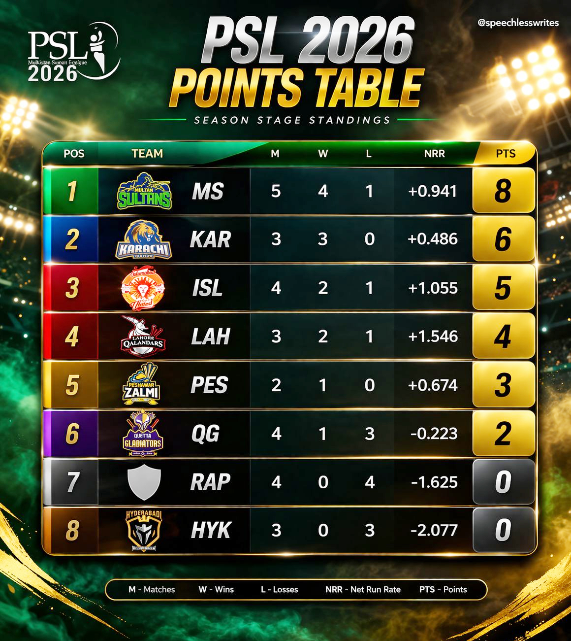 پی ایس ایل 11 کا پہلا مرحلہ ختم، پوائنٹس ٹیبل پر ملتان سلطانز کا پہلا نمبر