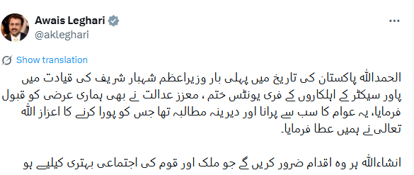 سماجی رابطے کی ویب سائٹ ایکس پر اپنے پیغام میں وزیر توانائی کا کہنا تھا کہ ملکی تاریخ میں پہلی بار وزیراعظم شہباز شریف کی قیادت میں پاور سیکٹر کے اہلکاروں کے فری یونٹس ختم کئے گئے ہیں۔