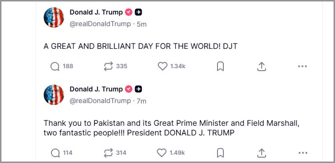 سماجی رابطے کی سائٹ ٹروتھ سوشل پر اپنے پیغام میں ڈونلڈ ٹرمپ نے کہا کہ شکریہ پاکستان، شکریہ وزیراعظم، شکریہ فیلڈ مارشل، دونوں شاندار شخصیات ہیں۔