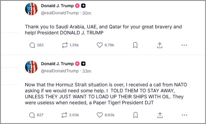امریکی صدر نے کہا کہ اب جب آبنائے ہرمز کا معاملہ ختم ہوچکا ہے، نیٹو کی جانب سے کال موصول ہوئی، اب ہمیں کسی کی مدد کی ضرورت نہیں ہے۔