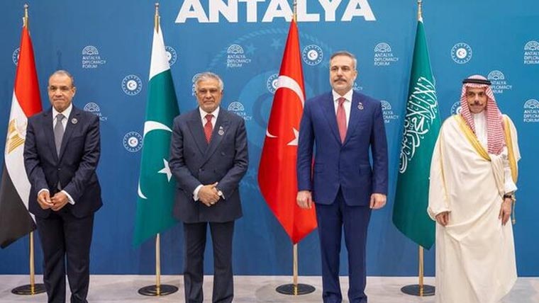 سعودی وزارتِ خارجہ کے مطابق وزیرِ خارجہ شہزادہ فیصل بن فرحان نے ترکیہ کے شہر انطالیہ میں ایک اہم چار فریقی اجلاس میں شرکت کی، ملاقات میں ان کے ہمراہ پاکستان کے وزیرِ خارجہ اسحاق ڈار، ترکیہ کے ہاکان فیدان اور مصر کے بدر عبدالعاطی شریک تھے۔