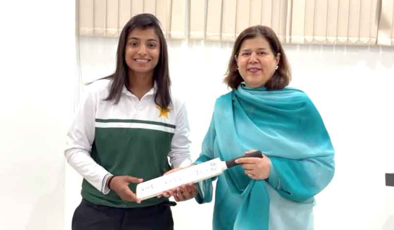 ملاقات میں پاکستان میں ویمنز کرکٹ کی ڈویلپمنٹ اور دیگر ویمنز سپورٹس سرگرمیوں پر گفتگو ہوئی، پاکستان ویمنز اے کرکٹ ٹیم کی کپتان حفصہ خالد نے پاکستان کی سفیر رخسانہ افضال کو دستخط شدہ بیٹ اور گرین کیپ پیش کی۔