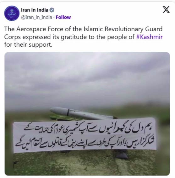 ایرانی سفارتخانے نے تصویر پوسٹ کی ہے جس میں ایرانی میزائل کے ساتھ پاسداران انقلاب کا پیغام تحریر ہے کہ ہم دل کی گہرائیوں سے کشمیری عوام کی حمایت کے شکرگزار ہیں اور آپ کی طرف سے اپنے رہنما کے قاتلوں سے انتقام لیں گے۔