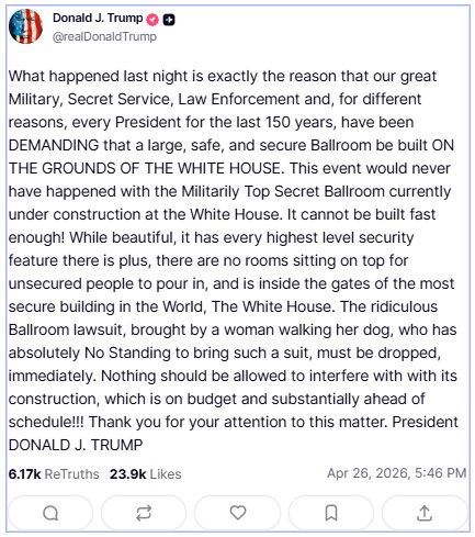سماجی رابطے کی ویب سائٹ ٹرتھ سوشل پر جاری بیان میں ڈونلڈ ٹرمپ نے کہا کہ گزشتہ رات جو واقعہ پیش آیا اس کی اصل وجہ یہی ہے کہ ہماری عظیم فوج، سیکرٹ سروس، قانون نافذ کرنے والے ادارے اور مختلف وجوہات کی بنا پر گزشتہ 150 برس کے دوران ہر صدر نے اس بات پر زور دیا کہ وائٹ ہاؤس کے اندر ایک بڑا، محفوظ اور سیکیور بال روم تعمیر کیا جائے۔