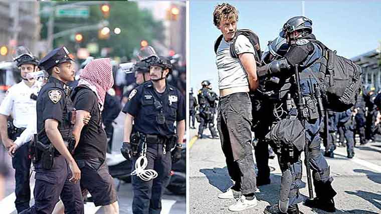 عالمی خبررساں ادارے کی رپورٹ کے مطابق ڈاؤن ٹاؤن لاس اینجلس بدھ کی رات کرفیو کے نفاذ کے باعث قدرے پرسکون رہا تاہم پولیس نے صدر ڈونلڈ ٹرمپ کے امیگریشن کریک ڈاؤن کے خلاف پانچویں دن کے مظاہروں کے بعد کرفیو کی خلاف ورزی کرنے پر 25 افراد کو حراست میں لے لیا۔صدرٹرمپ کیخلاف احتجاج دارالحکومت واشنگٹن، نیویارک، الینوے اور ٹیکساس تک پھیل چکا ہے اور کئی شہروں میں مظاہرین اور پولیس کے درمیان جھڑپیں بھی ہوئیں۔لاس اینجلس میں گزشتہ روز پولیس نے مظاہرین پر لاٹھی چارج اور آنسو گیس کی شیلنگ کی جبکہ پرتشدد احتجاج کے باعث شہر کے مختلف علاقوں میں مقامی وقت کے مطابق رات 8 سے صبح 6 بجے تک کرفیو نافذ کردیا گیا۔امریکی صدر ٹرمپ کی جانب سے لاس اینجلس میں مظاہروں سے نمٹنے کیلئے سینکڑوں میرینز بھی تعینات کردئیے ہیں ۔ امریکی میڈیا کے مطابق وفاقی جج نے ٹرمپ کی فوجیوں کی تعیناتی کے حکم کے خلاف دائر کیلیفورنیا کی درخواست مسترد کردی ہے ۔