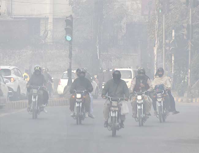 لاہور:موٹرسائیکل سوار شدید سموگ میں منزل کی جانب رواں دواں ہیں